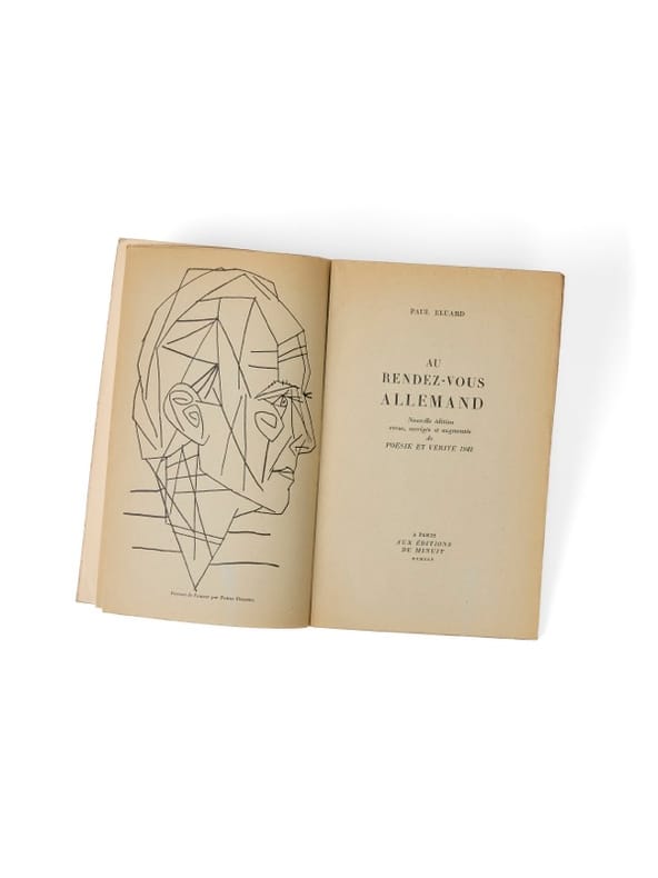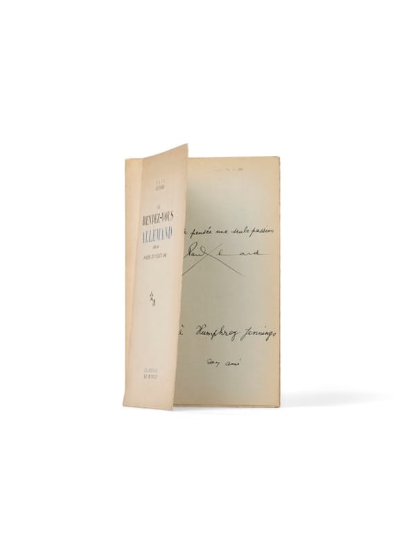 Longtemps publié dans la clandestinité, le cycle résistant d'Éluard est rassemblé à la Libération par Minuit : cette nouvelle édition revue, corrigée et augmentée réunit Au rendez-vous allemand et Poésie et vérité 1942, le recueil où figure « Liberté » et ajoute plusieurs textes inédits, conférant au volume la forme canonique des années d'Occupation. Ici, Minuit adopte sa physionomie d'après-guerre - l'étoile dessinée par Vercors - dans la continuité de sa naissance clandestine autour de Jean Bruller et Pierre de Lescure. L'envoi à Humphrey Jennings confère à cet exemplaire une belle provenance : cinéaste-poète majeur du documentaire britannique et proche des surréalistes, organisateur en 1936 de l'Exposition internationale du surréalisme à Londres, Jennings fut l'un des premiers passeurs d'Éluard outre-Manche ; on lui doit, avec David Gascoyne, les traductions de Benjamin Péret (A Bunch of Carrots puis Remove Your Hat, avec note d'Éluard et frontispice de Picasso), tandis qu'Éluard lui dédie un poème devenu emblématique - « Le mouvement a des racines / L'immobile croît et fleurit », rédigé au soir des accords de Munich et publié dans Donner à voir. Eluard n'oubliera pas, à l'aube de la paix retrouvée, son ami anglais, dans une dédicace particulièrement parlante puisqu'elle reprend le titre original du poème « Liberté», publié en avril 1942 dans la revue Fontaine sous le titre « Une seule pensée». Le portrait d'Éluard par Picasso présent ici est différent de celui utilisé pour l'édition de 1944 ; il reprend un dessin au trait réalisé le 6 octobre 1941, publié dans l'édition originale de Sur les pentes.inférieures.