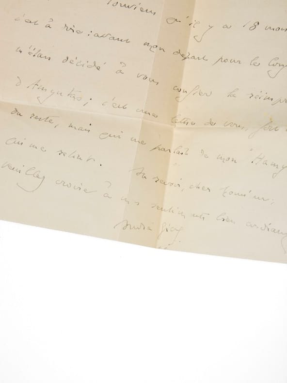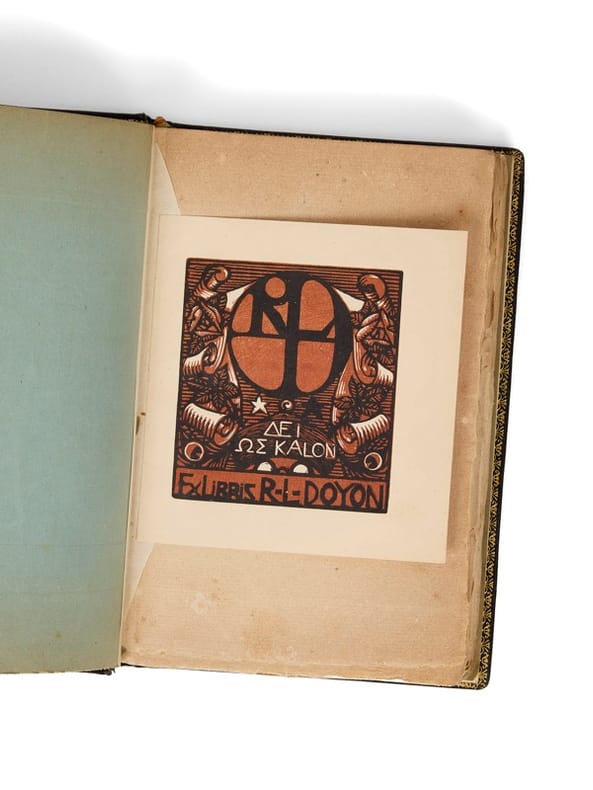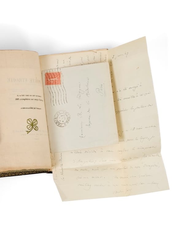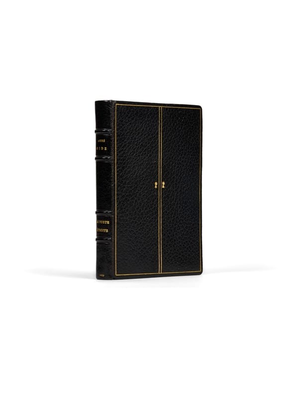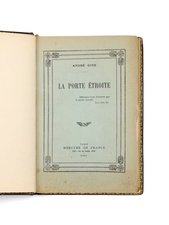 Le 13 juin 1905, Gide note dans son Journal «Chaque jour j'ai pu avancer de quelques lignes ma Porte étroite. Cette assiduité au travail m'est préférable aujourd'hui à la plus belle inspiration du monde », même si il se plaindra de la lenteur avec laquelle il progresse dans l'écriture de ce texte «Je passe des heures sur un groupe de phrases que je bouleverserai le lendemain. La scène, dans la chambre de Geneviève [...] m'a donné un mal extrême. Mais j'admire à présent tout ce que je suis arrivé à n'y pas dire, à réserver.» Bel exemplaire en reliure du temps signée de Jules-Karl Van West : ce relieur d'origine belge s'installa en 1925 à Saint-Brice-la-forêt, où il fait construire son atelier de reliure. Son épouse Jeanne participait au travail de l'atelier en se chargeant de la marbrure pour la confection de ses demi-reliures de qualité qui seront recherchées par les bibliophiles parisiens des années 20 et 30. En mars 1934, sa célébrité dépassera les frontières grâce à la vente de la bibliothèque Pierre Marteau (Drouot, mars 1934, Georges Andrieux expert), qui présentait un nombre très important de ses reliures. Il en acquit une encore plus grande renommée et se voit offrir par la reine Élisabeth de Belgique le poste de maître-relieur de l'École Supérieure des Arts Décoratifs de Bruxelles, et regagne la Belgique en décembre 1939. Après guerre, il devient professeur de reliure à La Cambre, formant entre autres August Kulche. Van West fut l'un des meilleurs praticiens de son temps, maîtrisant à la fois la reliure, la dorure et la dorure sur tranche, trois disciplines qu'il est rarissime de voir réunies dans les mêmes mains. Il sera également le relieur attitré du château de Beloeil, appartenant aux princes de Ligne, avant d'en être le conservateur ; il publiera, en 1950, ses Mémoires d'un relieur. Elle fût vraisemblablement commandée par celui y apposa son ex-libris : René-Louis Doyon. Libraire, éditeur et écrivain, il débute en 1913 chez Figuière : ses souvenirs de cette maison, de son directeur et du directeur littéraire Alexandre Mercereau, comptent parmi les pages les plus savoureuses qu’il ait laissées sur la vie éditoriale d’avant-guerre. En 1917, il ouvre sa propre librairie qui devient, l’année suivante, une maison d’édition où il y pratique une bibliophilie vivante faites de petits tirages imprimés avec soins, tous à l’enseigne de La Connaissance ; il fait figurer en tête de ses éditions une marque où figure sa devise « On se lasse de tout excepté de connaître ». On lui doit aussi des biographies attentives d’Isabelle Eberhardt, de Joséphin Péladan et de Jehan Rictus. En dépit de la qualité de son travail, son entreprise déclina à partir de 1933. Doyon entre alors chez Denoël qui rachète le fonds de sa maison en 1937 De la bibliothèque de R. L. Doyon (ex-libris) et envoi. Naville, 46, XXVIII.