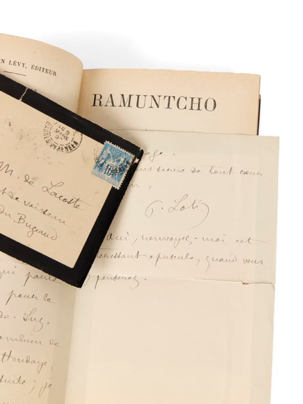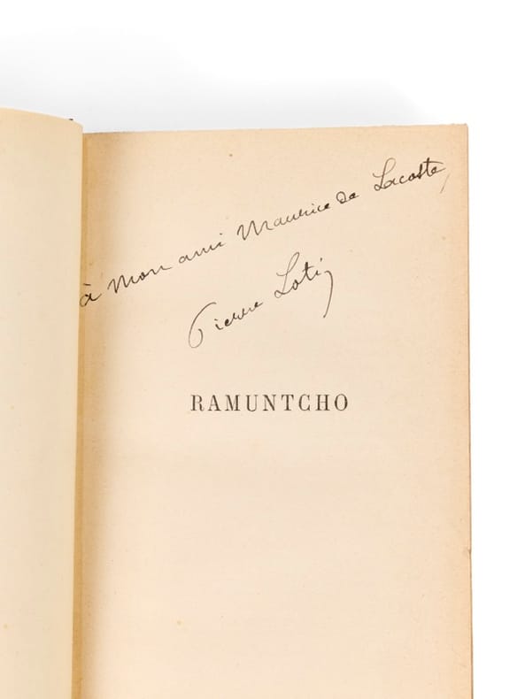 Important exemplaire : confidence secrète évoquant le «vrai» Ramuntcho, fils caché de Loti Paris, Calmann Lévy, 1897. 1 vol. (115 x 180 mm) de 351 p. Demi-chagrin bronze, dos à nerfs orné de fleurons dorés, titre doré, chiffre en pied « M. L.», couvertures conservés. Édition originale. Envoi signé : «à mon ami Maurice de Lacoste, Pierre Loti». Montée en tête : 1 enveloppe à l'adresse de Maurice de Lacoste, lieutenant de vaisseau, à bord du Calédonien /Salins d'Hyères (Var)» Conservée dans l'exemplaire : 1 lettre autographe signée (sur papier de deuil) adressée au même, avec env. conservée en date du 8 mars 1897 :