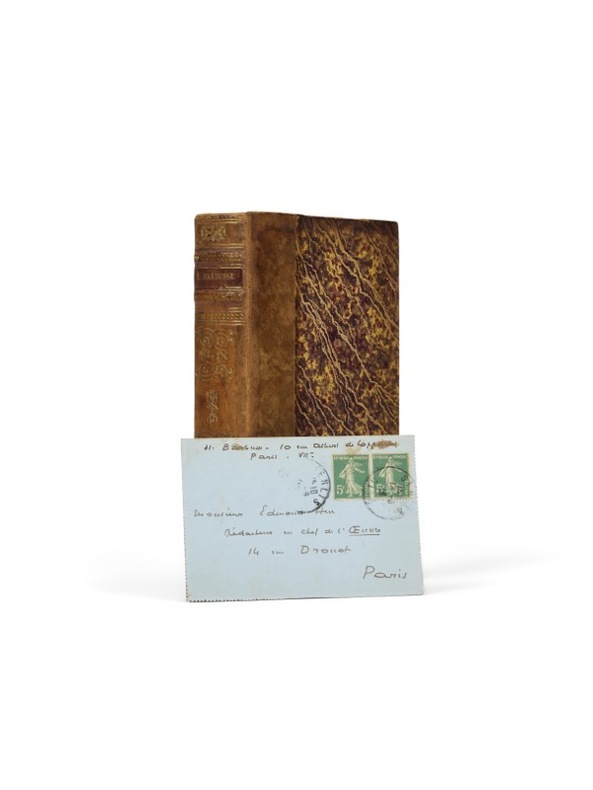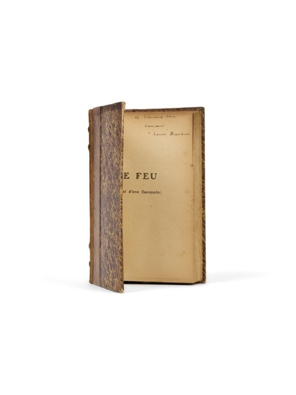 Au premier éditeur du Feu Paris, E. Flammarion, 1916. 1 vol. (115 x 180 mm) de 378 p. et [1] f. Demi-chagrin havane, dos à nerfs orné, monogramme «E. H.» en pied, couvertures conservées. Édition originale. Envoi signé : «à Edmond Hue, son ami, Henri Barbusse». Conservée dans l'exemplaire, une lettre autographe signée au même, datée du 13 juin 1916, l'informant des prochaines livraisons des épreuves du Feu, à paraître dans son journal L'œuvre à partir du 3 août.