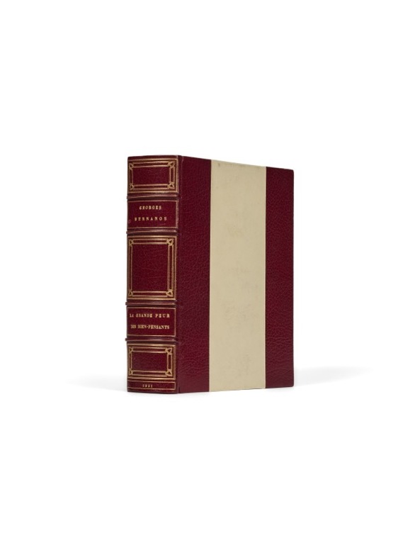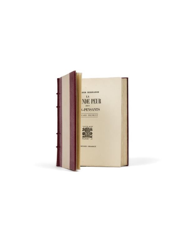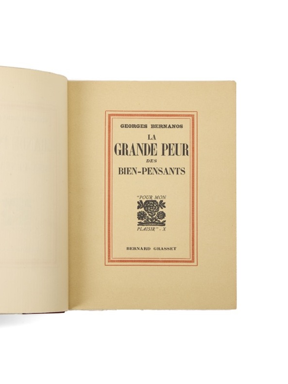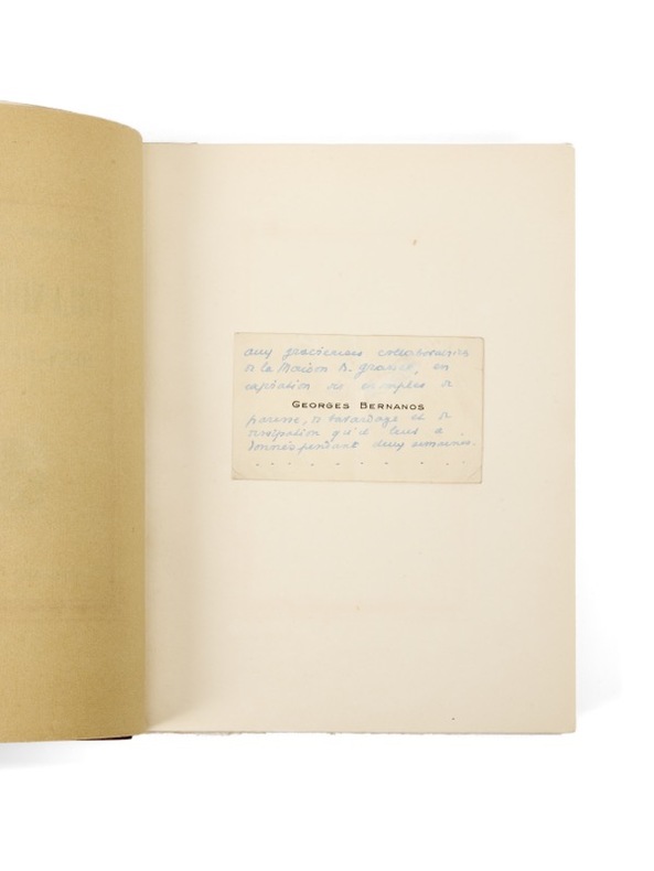 La Grande Peur des bien-pensants marque le moment d'une rupture importante dans l'histoire des droites françaises : le texte rassemble pour partie des textes publiés entre 1929 et 1931, certains écrits dans L'Action française, d'autres sous forme de conférence. Sa parution précède la rupture entre Maurras et Bernanos, qui date de mai 1932, lorsque le chantre du nationalisme intégral écrira dans L'Action française du 16 mai son célèbre «Je vous dis adieu, Bernanos». Une évolution engagée chez Bernanos depuis plusieurs années et qui le conduira au positionnement salutaire que l'écrivain adoptera quelques années plus tard. C'est avant tout un texte de soutien à l'abominable Édouard Drumont et à son oeuvre majeure La France juive, qu'il faut malgré tout avoir lue. Mais s'il y a bien rupture entre Bernanos et Maurras, la nature de l'antisémitisme de l'écrivain catholique, bien réel dans ce panégyrique de Drumont, soulève encore les passions aujourd'hui. Cette biographie de Drumont est surtout un pamphlet qui dénonce le déclin de la nation tombée entre les mains de la bourgeoisie conservatrice dans les premières décennies de la IIIe République. « On voit habituellement en Georges Bernanos un écrivain très proche de L'Action française, si ce n'est l'écrivain maurrassien par excellence. En réalité, s'il fut en effet maurrassien convaincu dans sa jeunesse, journaliste militant à L'Avant-Garde de Normandie en 1913-1914, proche du mouvement à l'époque de Sous le soleil de Satan et de la condamnation de l'Action française par le Vatican (1926-1927), sa rupture avec Maurras en 1932 révèle toute la distance qui le sépare en profondeur du mouvement royaliste. Il est logique que Bernanos en vienne à condamner Maurras, coupable de complaisance envers les dictatures conquérantes, au temps de Munich et de la guerre d'Espagne (...).Opposé à la vision maurrassienne de l'Histoire parce qu'il a toujours choisi le romantisme de l'aventure personnelle contre le positivisme de la raison politique, opposé au «catholicisme sans Christ» de la France maurrassienne au nom même du Dieu de l'Évangile, il a bâti son oeuvre d'écrivain sur une quête spirituelle qui est restée totalement étrangère, en définitive, aux idées et aux valeurs de ce journal (...)» (Denis Labouret, Georges Bernanos et l'Action française : histoire d'un malentendu). La lettre autographe montée en tête est adressée à une écrivaine et amie de Léon Bloy : «Madame, je suis désolé - (?) et désolé - de vous avoir rencontrée hier si affreusement mal à propos - Piotsch (?) à ma droite, Talbois à ma gauche, tandis que cet horrible bavard donnait le spectacle à la tribune d'une vanité convulsée jusqu'au spasme, offrant généreusement sa salive et sa sueur. Sans doute ai-je parfaitement tort de confier à l'administration des Postes une opinion qui doit être très différente de la vôtre puisque votre imagination garde assez de jeunesse et de générosité pour regarder cette sorte d'humanité sans tristesse, et même avec la joie amère, un peu sauvage, qu'on retrouve dans les pages les plus inspirées de vos livres. Mais j'aime autant que vous me preniez pour un imbécile et vous dire que partout ailleurs j'aurais su exprimer quelque chose de mon admiration pour la si fraternelle, si compatissante amie du vieux Bloy, et l'auteur de tant de livres hardis et forts, qui pourraient servir de leçon a un certain nombre de jeunes écrivains du sexe mâle,... Georges Bernanos». Très bel exemplaire. De la bibliothèque Charles Hayoit (Paris, Sotheby's & Poulain-Le Fur, 30 novembre et 1er décembre 2001, lot 942), avec ex-libris.
