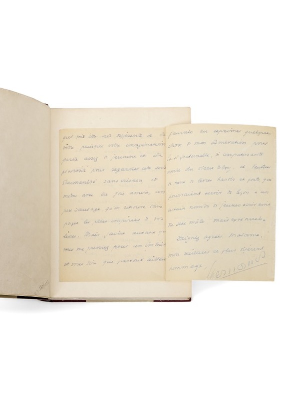 Un des six de tête sur japon nacré Paris, Grasset, coll. « Pour mon plaisir », (9 février) 1931. 1 vol. (175 x 230 mm) de 458 p., [2] et 1 f. Demi-maroquin rouge à bandes, dos à nerfs orné de caissons dorés, titre doré, date en pied, couvertures et dos conservés. Édition originale. Un des 6 premiers exemplaires sur japon nacré (n° III). Joints : une belle lettre autographe signée destinée à une « amie du vieux Bloy » (4 p.), et une carte de visite de l'auteur contenant l'inscription suivante : «aux gracieuses collaboratrices de la Maison B. Grasset, en expiation des exemples de paresse, de bavardage et de dissipation qu'il leur a donnés pendant deux semaines».