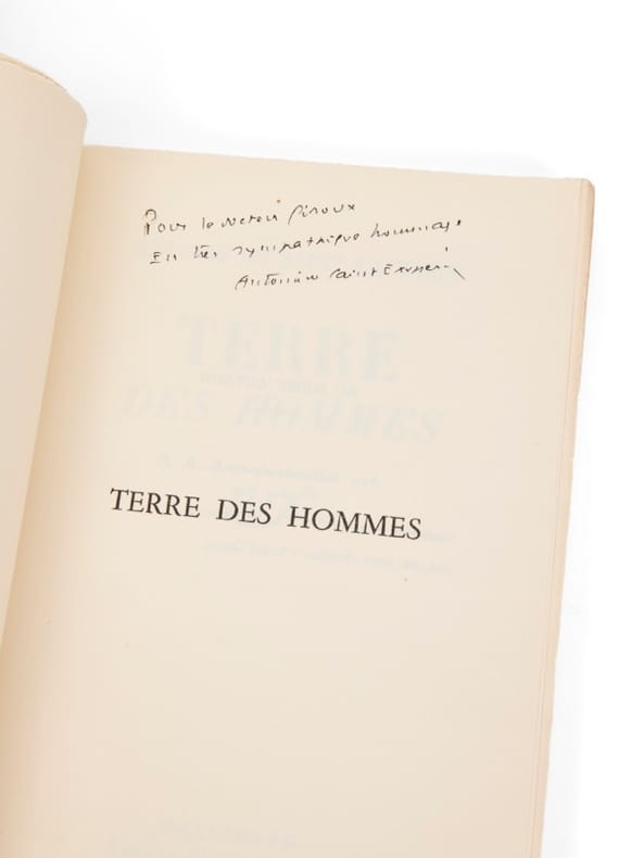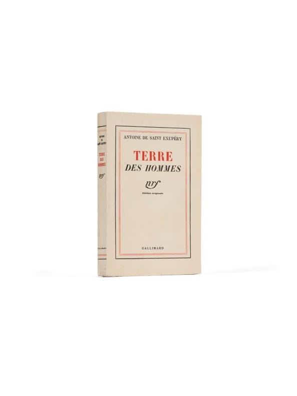 C'est en janvier 1938 que Saint-Exupéry débarque pour la première fois aux États-Unis pour tenter le raid New York - Terre de feu. Il bénéficie déjà d'une bonne réputation grâce à la traduction de Night Flight (Vol de nuit) en 1932 et Southern Mail (Courrier Sud) en 1933. Il a déjà en tête son nouveau livre dont le titre est, pour l'heure « Étoiles par grand vent » : un recueil de textes épars précédemment publiés dans la presse hebdomadaire et quotidienne, depuis Marianne (1932-1934), La NRF (1933), Air France Revue (1935), Minotaure (1935), L'Intransigeant (1936-37) et Paris-Soir (1936-1938), qu'il décide de reprendre en totalité. Une genèse singulière qui en dit long sur le bouleversement du statut de l'écrivain durant l'entre-deux-guerres et sur l'évolution des supports qui sont à sa disposition pour porter son oeuvre, fut-elle de reportage, à la connaissance de ses lecteurs. Maximilien Becker devient son agent littéraire et ce dernier lui fait signer un contrat. Ses éditeurs américains ont également engagé Lewis Galantière pour la traduction de son livre à venir : une longue correspondance s'engage entre les deux hommes pour l'élaboration du futur Terre des hommes / Wind, Sand and Stars, dont les deux versions sont composées presque simultanément. La version française est publiée en février 1939, l'édition américaine en juin : Saint-Exupéry laissa les éditeurs trancher, quant à la parution new-yorkaise, leur soufflant celui qu'il avait abandonné pour Terre des hommes : « Étoiles par grand vent » et « Grand vent sous les étoiles ». Galantière choisira celui de Wind, Sand and Stars, d'après un passage présent dans l'ouvrage. Signalons que l'édition américaine contient un chapitre supplémentaire, « Les Éléments ». Seule deux dactylographies sont connues : une à la BnF, l'autre, remise à l'imprimeur et offerte à Jean Artur (Ventes Aristophil, 35, novembre 2020, n° 426). Terre des hommes obtient le grand prix du roman de l'Académie française et le National Book Award aux États-Unis : un succès jamais démenti. Mais malgré ces récompenses prestigieuses, Saint-Exupéry considéra que la plus belle fut le cadeau fait par les ouvriers de l'imprimerie de Lagny-sur-Marne : un exemplaire unique imprimé sur toile d'avion. Bel exemplaire broché avec envoi : une rare concordance.