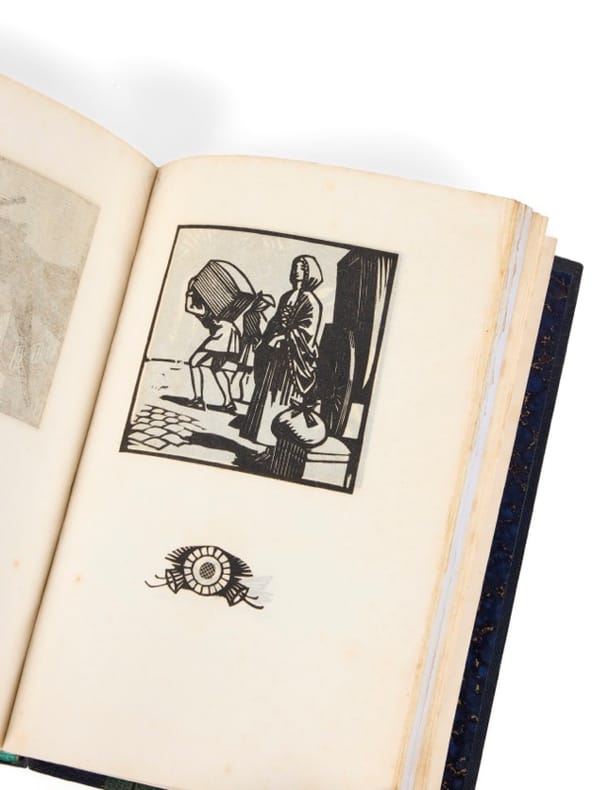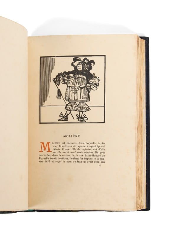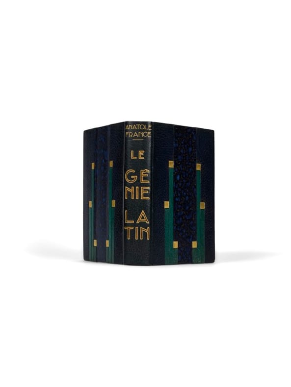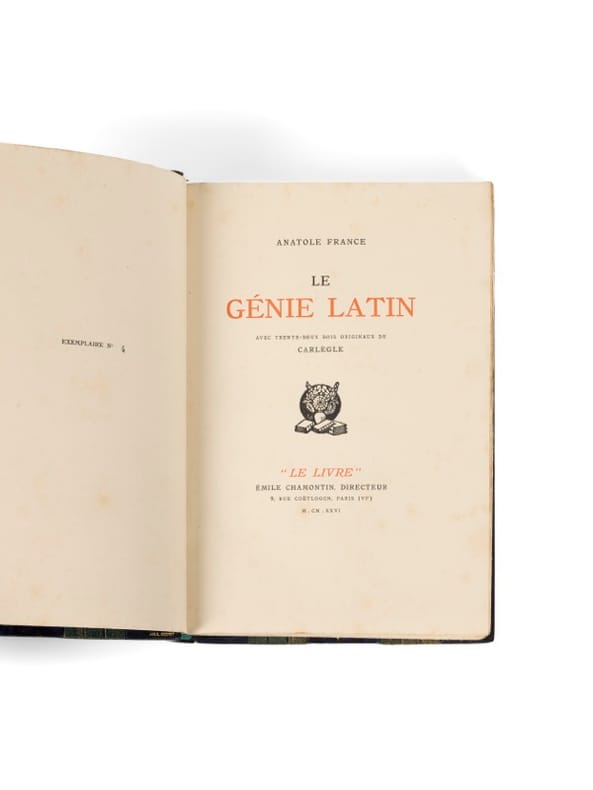 De sa jeunesse passée au quai Malaquais, dans la librairie paternelle, Anatole France a gardé le culte de l'érudition heureuse : ce volume réunit ses grandes préfaces - de Longus (Daphnis et Chloé) à la Reine de Navarre, Scarron, La Fontaine, Molière, Racine, Lesage, l'abbé Prévost, Bernardin de Saint-Pierre, Xavier de Maistre, Benjamin Constant, Chateaubriand, Sainte-Beuve, jusqu'à l'hommage final à Albert Glatigny - et les transforme en portraits littéraires dans la même élégance narrative qui caractérise ses romans. Sous le titre rassembleur de « génie latin », France compose ainsi son panthéon critique, sans lieux communs ni sentiments convenus et dont l'insertion de Glatigny dit assez l'attention d'Anatole France aux destinées discrètes et à la fraternité des lettres. Initialement publiée en 1913, cette édition doit beaucoup à l'art de Carlègle (Charles-Émile Égli, 1877-1937), maître de la gravure sur bois et de l'illustration de luxe après 1918 (L'Assiette au beurre, Le Rire, La Vie parisienne), dont les planches firent sa renommée auprès des bibliophiles. Précieux tirage de tête, limité à 10 exemplaires, avec double-suite : il fut relié par Paul Bonet au tout début de sa carrière, au tournant des années 30.