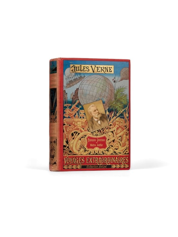 Première édition grand in-8 ornée de 78 illustrations et de 12 planches en chromotypographie par George Roux et de 2 cartes en couleurs. Cartonnage éditeur Hetzel "au portrait collé" en pleine percaline rouge signé A. Lenègre, premier plat polychrome signé Souze représentant divers moyens de locomotion (ballon, locomotive, bateaux), un portrait de l'auteur dans les tons sépias contrecollé au centre, divers instruments de navigation rehaussés à l'or au premier plan, second plat de type "e" comme indiqué par Jauzac, dos orné de plusieurs illustrations en couleur et à l'or, pages de garde bleues d'origines, toutes tranches dorées. Catalogue HF in-fine. Dos très légèrement assombri, coins légèrement émoussés, quelques petites rousseurs. Aventures maritimes qui racontent une chasse au trésor, menant le héros de la Tunisie au golfe de Guinée, puis en Ecosse, à l'île de Spitzberg, et enfin en Sicile. - Photographies et détails sur www.Edition-Originale.com -