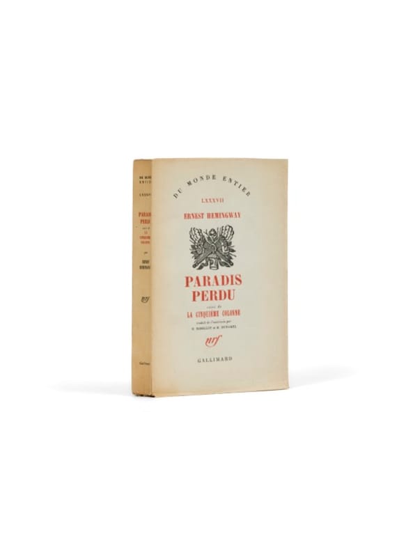 Paradis perdu, nouvelle principale du recueil, a paru aux États-Unis dans la revue Transition en 1927, avant d'être traduite et incluse en France dans ce recueil de nouvelles inédites, écrites entre 1921 à 1938 et tirées d'un volume paru aux Etats-Unis en 1939 sous le titre : « La Cinquième Colonne et les quarante-neuf premières nouvelles » ; deux autres des nouvelles seront traduites séparemment en français : Cinquante mille dollars et Dix Indiens. Hills Like White Elephants - son titre original - aborde, sans le nommer afin d'éviter la censure, la question de l'avortement et le renoncement, pour une femme, r au rêve d'avoir un enfant. Philippe Sollers en donnera en 1992, dans la revue littéraire L'Infini (n°37),une traduction intégrale sous le titre Collines comme des éléphants blancs, qui reprend mot à mot le titre d'Hemingway. Bel état de la fragile couverture.