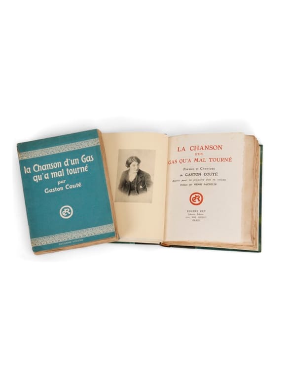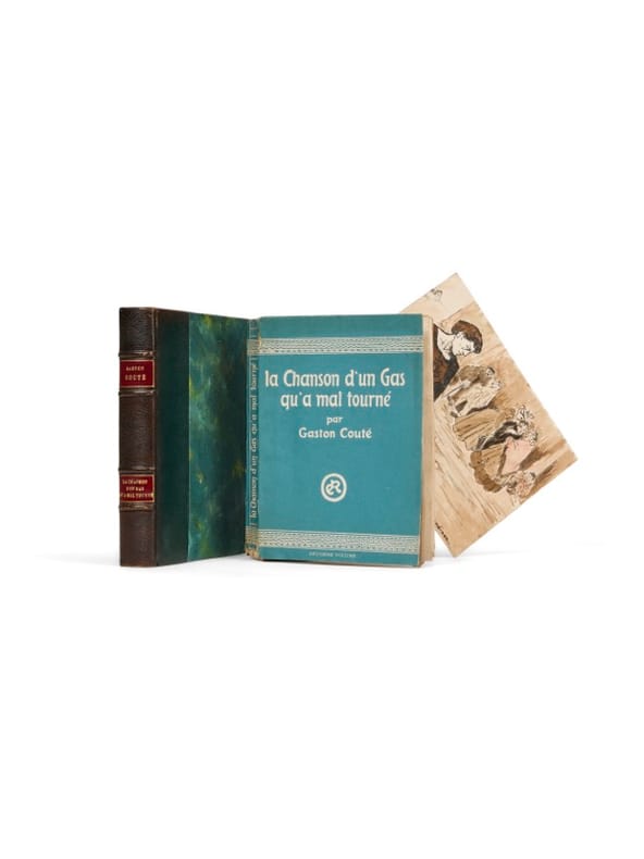 Poète libertaire et chansonnier majeur de la veine populaire française, Gaston Couté incarne l'une des voix régionales les plus âpres et les plus justes de la Belle Époque sociale. Né à Beaugency et élevé à Meung-sur-Loire, dans le Loiret, dans un milieu rural modeste, il forge très tôt une langue poétique nourrie de patois beauceron et d'argot ligérien. Proche des milieux libertaires, Couté publie chaque semaine des textes engagés qui dénoncent l'injustice sociale et l'exploitation paysanne, qu'il vient défendre dans les cabarets montmartrois. Jehan-Rictus salua en lui « un adolescent de génie » à la poésie rugueuse mais profondément incarnée. Il meurt précocemment en 1911, à l'âge de 31 ans, sans jamais n'avoir rien publié en dehors des parutions en revue de ses poèmes et chansons. La Chanson d'un gas qu'a mal tourné rassemble la part essentielle de cette oeuvre brève mais fulgurante, pour la première fois. Bel exemplaire, très bien enrichi d'une grande aquarelle de Paul Jacob-Hians. Peintre et graveur, diplômé de l’école Estienne, il fréquente les cercles de Montmartre et de Montparnasse avant de devenir, en 1917, décorateur et créateur de costumes de la troupe du théâtre du « Vieux Colombier ». Très rare en tirage de tête.