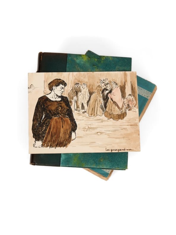 Avec gouache originale Paris, Eugène Rey, (mai) 1928. 2 vol. (150 x 200 mm) de 246 p. chacun. Demi-chagrin vert, pièce de titre et couvertures conservées (t. 1) ; Broché (t. 2). Édition originale, illustrée d'un portrait photographique de l'auteur (tome 1) et portrait gravé par Jacob-Hians (tome 2). Un des 150 exemplaires sur Auvergne à la forme (n° 2 et 5). L'exemplaire est enrichi d'une aquarelle originale en couleurs (200 x 150 mm) de [Jacob-Hians] légendée «les gourgandines» et d'un dessin sur calque en couleurs.