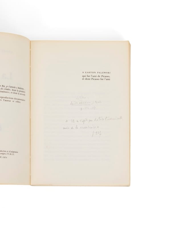 C'est en 1973, invité par la veuve du peintre, Jacqueline Picasso, que Malraux se rend à Mougins puis à Vauvenargues choisir des toiles pour une donation à l'État de tableaux. Cette pérégrination dans l'atelier du défunt peintre, mais aussi dans les couloirs de la toute nouvelle fondation Maeght donnera lieu aux réflexions consignées dans La Tête d'obsidienne, lesquelles prendront part, réduites, dans l'agencement tardif du Miroir des limbes. « Tout homme qui écrit et qui écrit bien sert la France », a un jour confié le général de Gaulle à André Malraux. Maurice Genevoix aura donc doublement servi son pays ; par le corps et par l'esprit. Grièvement blessé dans des combats à Rupt-en-Woëvre près de la colline des Éparges, en 1915, il y perd l'usage de son bras gauche et est réformé à 70% d'invalidité. Son tout premier récit de guerre, Sous Verdun, publié en 1916, sera partiellement censuré. En 1949, alors élu académicien depuis trois ans, il publie Ceux de 14, qui a fait sa gloire de conteur tragique que n'a sans doute pas renié André Malraux, - l'inoubliable orateur du transfert des cendres de Jean Moulin au Panthéon, le 19 décembre 1964, que Maurice Genevoix rejoindra 56 ans plus tard, le 11 novembre 2020. La dédicace de Malraux évoque un dîner chez Ludmilla Tcherina : danseuse, comédienne, peintre et sculpteur, future marraine de l'exposition "félines" dédiée à André Malraux en 1981, elle partageait avec ce dernier une passion pour les chats. La "charmante voisine" est probablement la fille du couple Genevoix, Sylvie, qui vient de terminer à Paris ses études de Lettres classiques et qui deviendra par la suite une grande figure de l'édition contemporaine. Pour l'anecdote, Ludmilla Tcherina est indirectement bien connue des bibliophiles : elle est la fille de Stéphane et d'Avenir Tchemerzine, les auteurs de la célèbre bibliographie des éditions originales de la poésie française du Moyen Âge au XIXe siècle. Elle hérita de ses parents d'une collection importante de livres précieux. De la bibliothèque de Maurice Genevoix (envoi et ex-libris).