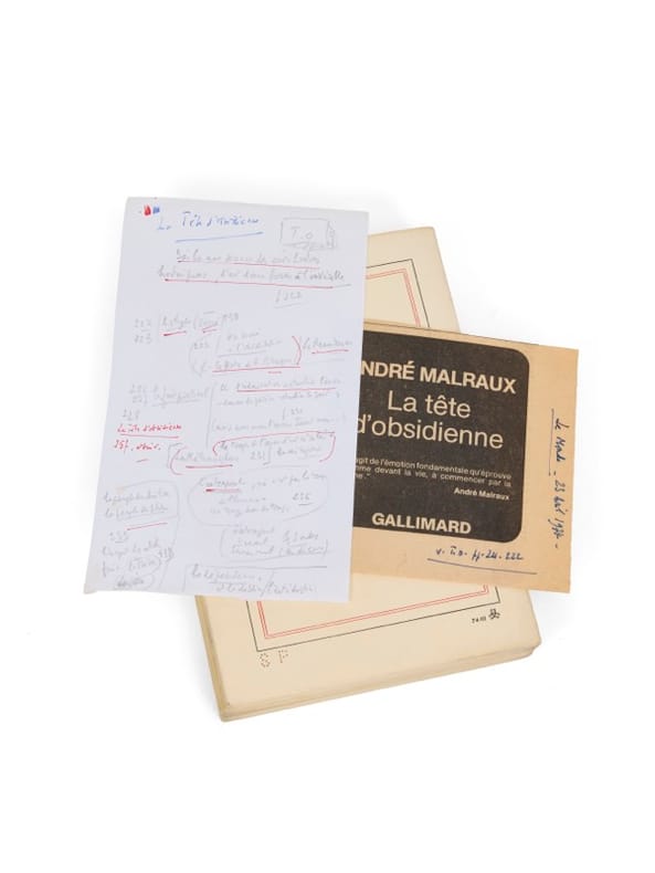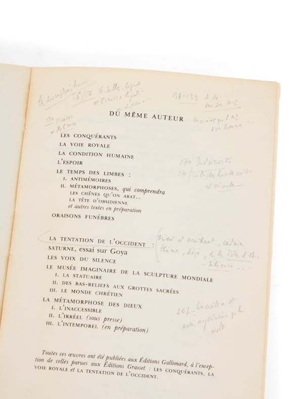 Exemplaire Maurice Genevoix avec envoi signé. Paris, Gallimard, (15 février) 1974. 1 vol. (140 x 205 mm) de 278 p., [2], 47 planches en noir, [3] et 1 f. Broché. Édition originale. Un des exemplaires poinçonnés du service de presse. Envoi signé : « Pour Maurice Genevoix, avec l'amical souvenir, pour Madame Maurice Genevoix, avec les respectueux hommages d'André Malraux, et pour la charmante petite voisine du dîner de Ludmilla Tcherina ».
