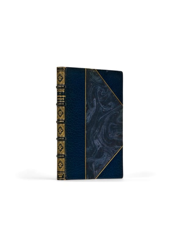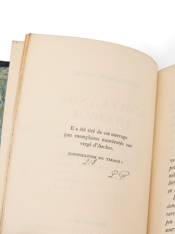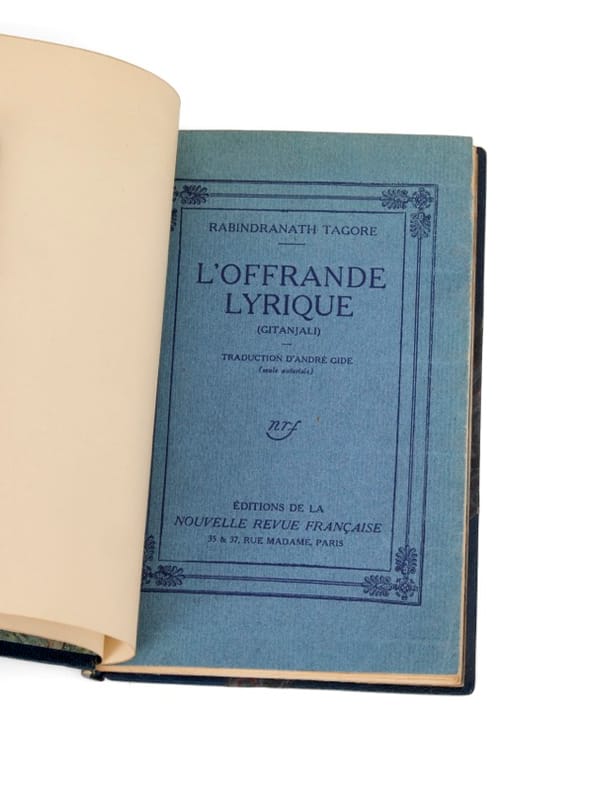La première traduction française de Gitanjali, le recueil emblématique du poète bengali Rabindranath Tagore, prix Nobel de littérature en 1913 - la même année que cette publication, entreprise en urgence pour accompagner l'actualité de cette distinction majeure. La traduction d'André Gide s'appuie sur la version anglaise que Tagore lui-même avait traduite. La préface introduit ainsi au public français l'oeuvre de celui qu'il nomma «le prophète de l'âme ; l'un de ces très rares hommes dont le contact vous rend meilleur». Le style dépouillé et mystique du recueil exerça une forte influence dans les milieux symbolistes et spiritualistes français, publié à peine quelques semaines après l'annonce du prix Nobel - une première pour un auteur non occidental. Bien complet du feuillet d'errata, imprimé sur japon.