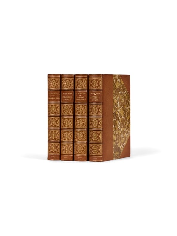 L'épopée complète en reliure uniforme de Semet & Plumelle Paris, Calmann Lévy, 1897 et 1899. 4 vol. (115 x 185 mm) de 336, 350, 419 et 404 p. Demi-maroquin havane à coins, dos à nerfs orné de caissons d'encadrement et de petits fers, filets pointillés sur les mors, tête dorée sur témoins, titre doré, date en pied, couvertures et dos conservés (reliure signée de Semet & Plumelle). Éditions originales. Série complète des quatre titres de l'Histoire contemporaine.