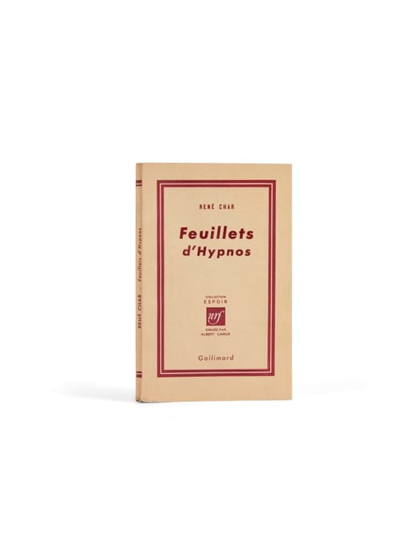 Les Feuillets d'Hypnos ont été écrits entre 1943 et 1944 à Céreste - lorsque le poète, « Capitaine Alexandre », était à la tête de la Section Atterrissages-Parachutages des Bases-Alpes. Il se surnommait alors « Hypnos », l'homme qui veille sur son peuple durant la nuit : son écriture fragmentaire est imposée par les exigences de l'engagement dans la Résistance : « J'écris brièvement. Je ne puis guère m'absenter longtemps », indique à la note 312 René Char qui cesse à l'été 1943 de se consacrer à Seuls demeurent pour ne plus consigner que de brèves notations sur un carnet. Une première dactylographie de 72 fragments est établie à la Libération, qu'il reprend l'année suivante : « Je me suis mis violemment au travail, écrit-il à Gilbert Lely le 17 juillet 1945. Cela s'appelle : Carnet d'Hypnos (Hypnos est un nom d'homme) 1943-1944. J'ai été assez heureux pour retrouver récemment le journal que je tenais à Céreste, enfoui à mon départ pour Alger dans un trou de mur. C'est ce journal que je vais publier [...]. Je mets de l'ordre dedans, j'abrège ou je développe suivant les cas. » Il ajoute en particulier les fragments 204 et 221 écrits à Alger à l'été 1944. Ce travail aboutit en août 1945 à une seconde dactylographie, destinée à l'imprimeur, actuellement conservée à la Bibliothèque littéraire Jacques Doucet avec cette note : « Il n'existe pas d'autre manuscrit des Feuillets d'Hypnos. J'ai détruit, pour des raisons faciles à comprendre, le carnet des originaux [...] hormis un feuillet conservé comme témoin ». Dédié à Albert Camus, ces Feuillets d'Hypnos sont à l'origine de l'amitié entre les deux hommes, le recueil n'étant d'ailleurs pas sans lien avec des idées développées dans L'Homme révolté. Il s'agit au demeurant du premier titre de la collection « Espoir », que dirige Camus et qui porte ses aspirations : «Nous sommes dans le nihilisme. Peut-on sortir du nihilisme ? C'est la question qu'on nous inflige. Mais nous n'en sortirons pas en faisant mine d'ignorer le mal de l'époque ou en décidant de le nier. Le seul espoir est de le nommer au contraire et d'en faire l'inventaire pour trouver la guérison au bout de la maladie. Cette collection est justement un inventaire.» Coron (sous la dir. de) - René Char. Catalogue de l'exposition de la Bibliothèque nationale de France, 4 mai - 29 juillet 2007, Paris, Bibliothèque nationale de France / Gallimard, 2007, p. 79, n° 106.