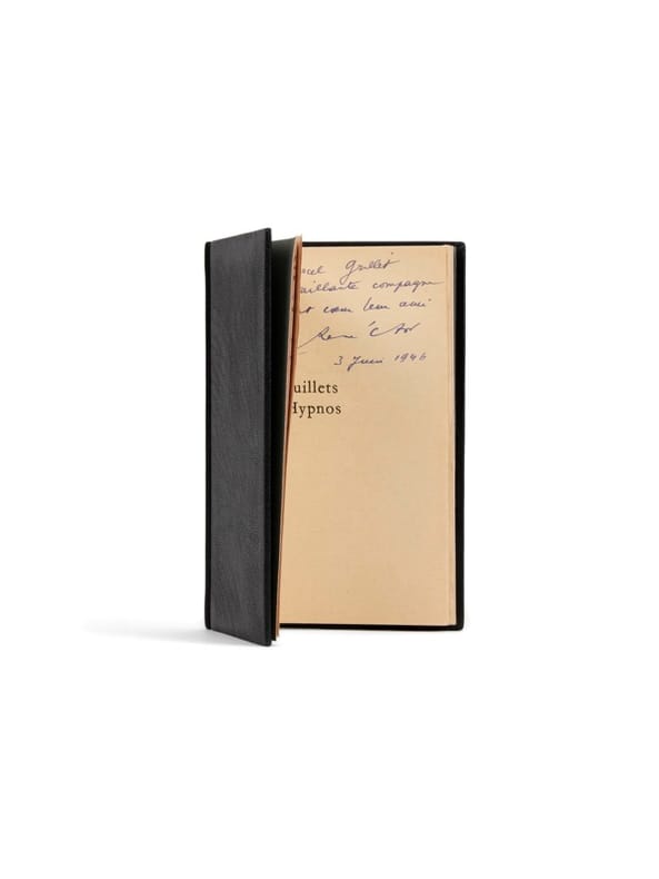 Exemplaire Marcel Grillet avec envoi Paris, Gallimard, coll. « Espoir », (20 avril) 1946. 1 vol. (120 x 185 mm) de 97 p. et [3] f. Bradel chagrin noir, titre doré en long. Édition originale. Un des exemplaires imprimés du service de presse. Envoi signé : «à Marcel Grillet, à sa vaillante compagne. De tout cœur, leur ami René Char, 3 Juin 1946». Montée en tête : lettre autographe signée (2 p. en 1 f.) datée du 29 janvier 1947 et adressé à «Marcel».