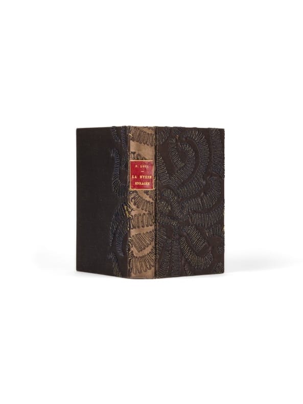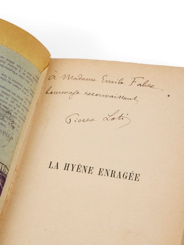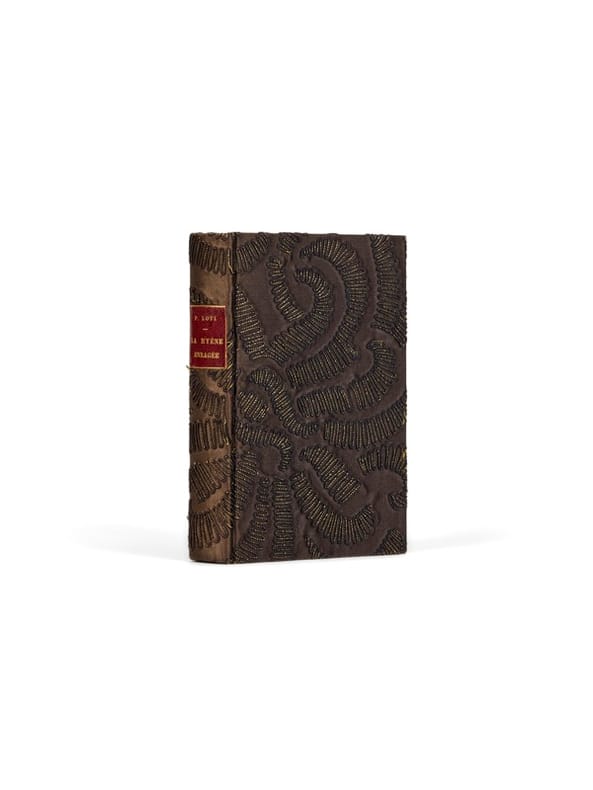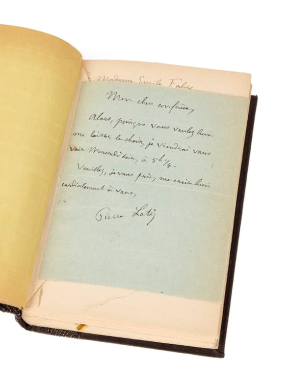 Envoi signé en exquise reliure d'époque Paris, Calmann-Lévy, coll. « Bibliothèque contemporaine », [1916]. 1 vol. (120 x 185 mm) de [4] f. et 296 p. Soie brodée à la bradel, plats ornés d'un décor au fil d'or passant sur le dos, pièce de titre rouge, couvertures et dos conservés (reliure de l'époque). Édition originale. Envoi signé : « à Madame Émile Fabre, hommage reconnaissant, Pierre Loti ». Monté en tête : mot autographe signé sur carte pneumatique, adressée « à Monsieur Émile Fabre, directeur de la Comédie française ».