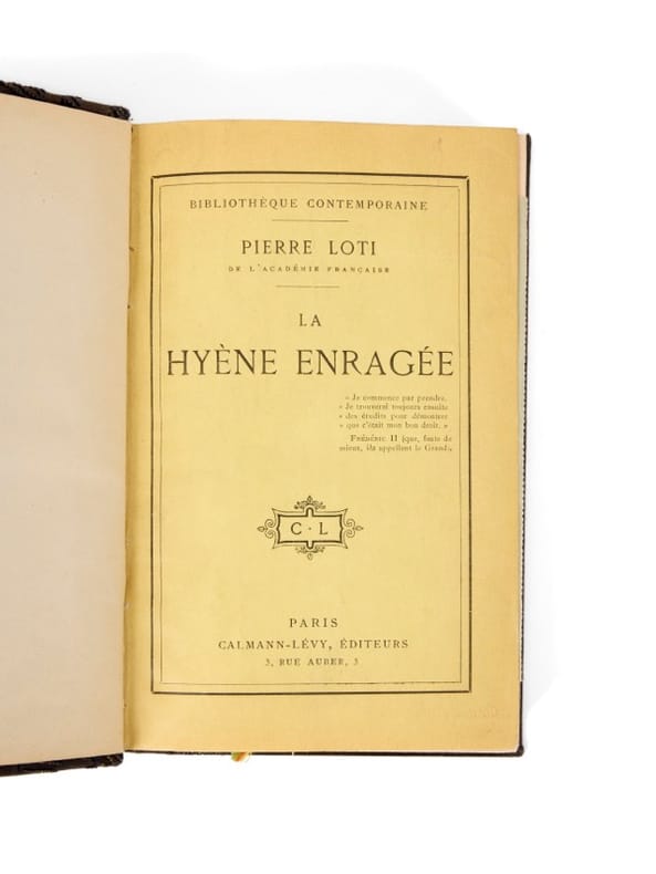 Ce recueil de textes de guerre réunit des notes inédites prises d'août 1914 à avril 1916 et deux plaquettes déjà parues : La Grande Barbarie (vendue au profit des victimes belges en 1915) ; À Soissons, texte lu par Loti à l'Institut de France le 25 octobre 1915. La Hyène enragée s'ouvre sur la lettre que Loti adressa au Ministre de la Marine pour qu'il accepte son intégration à « n'importe quel poste me rapprochant de l'ennemi ». Aller au front, alors que la guerre vient d'éclater, que son fils unique Samuel, maréchal de logis au 77e régiment d'infanterie part au front, est son voeu le plus cher. Mais l'ancien commandant de vaisseau Lucien Viaud alias Loti est alors âgé de soixante-quatre ans. Il lui faudra l'appui de l'ancien président du Conseil Louis Barthou et de Raymond Poincaré pour être finalement nommé agent de liaison au grade de colonel auprès du général Gallieni le 25 septembre 1914. Voilà donc Loti reprenant du service, non pas dans la marine mais, à son grand dam, cantonné à servir là où on eut besoin de lui pour quelques missions diplomatiques notamment avec la Turquie, sa deuxième patrie ; sur son insistance, il put quelquefois se rapprocher des combats : les tranchées, les postes d'ambulance et les hôpitaux du front lui fourniront la matière de ses articles de guerre de La Hyène enragée et de L'Horreur allemande. « Toutes ces croix, toutes ces croix, enguirlandés de givre, elles ont les bras comme frangés de pauvres larmes silencieuses, qui se seraient figées sans pouvoir tomber » : Loti fut plus reporter que combattant en cette guerre qui le dégoûta et le laissa si malade qu'on le renvoya définitivement chez lui en novembre 1917. « Ce n'est pas facile d'employer ce marin de terre » écrira plus tard le maréchal Franchet-d'Esperey. Intéressante reliure de l'époque dans le goût de Louise Germain.