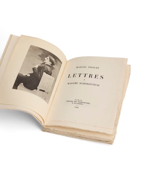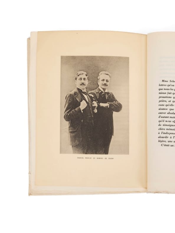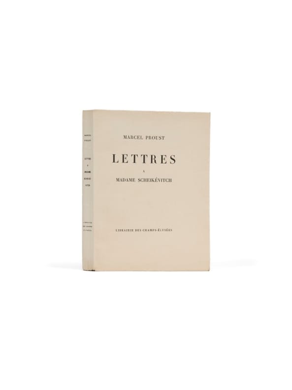 L'ouvrage reproduit vingt-huit lettres de Marcel Proust adressées à Marie Scheikevitch, accompagnées de télégrammes, de coupures de presse et de deux photographies de l'écrivain (dont une avec Robert de Flers). Fille d'un riche magistrat russe installé en France à la fin du XIXᵉ siècle, Marie Scheikevitch (1882-1964) fut l'une des grandes figures mondaines et intellectuelles du Paris de la Belle Époque et de l'entre-deux-guerres. George D. Painter la décrit comme « l'une des maîtresses de maison les plus intelligentes et les plus en vue de la nouvelle génération ». Protectrice d'artistes et d'écrivains, elle réunit dans son salon des personnalités telles que Jean Cocteau, Anna de Noailles, Reynaldo Hahn ou encore la famille Arman de Caillavet. Si Proust l'aperçoit brièvement dès 1905 dans le salon de Madeleine Lemaire, leur véritable relation commence en 1912. Cette année-là, Jean Cocteau et Marie Scheikevitch lisent ensemble dans Le Figaro un article de Proust consacré à «La Grande Pitié des églises de France» et décident d'adresser à l'auteur des dépêches de félicitations. Ce geste marque le début d'une relation durable qui se poursuivra jusqu'à la mort de l'écrivain en 1922. Les deux amis se voient alors très fréquemment - « presque tous les jours », dira-t-elle plus tard - ce qui explique la relative rareté de leurs lettres : seules vingt-huit sont aujourd'hui connues. Marie Scheikevitch joue pourtant un rôle non négligeable dans la carrière de Proust. Elle lui ouvre les portes de son salon et contribue activement à faire connaître son oeuvre dans les milieux mondains et intellectuels parisiens. C'est notamment elle qui le recommande à son amant Adrien Hébrard, directeur du journal Le Temps, ce qui permettra la célèbre interview de Proust par Élie-Joseph Bois le 12 novembre 1913, premier grand article de presse consacré à À la recherche du temps perdu, à la veille de la publication de Du côté de chez Swann. Proust lui rendra hommage dans Sodome et Gomorrhe sous les traits de Mme Timoléon d'Amoncourt, « petite femme charmante, d'un esprit, comme sa beauté, si ravissant qu'un seul des deux eût suffi à plaire ». Bel exemplaire hors commerce sur vieux japon.