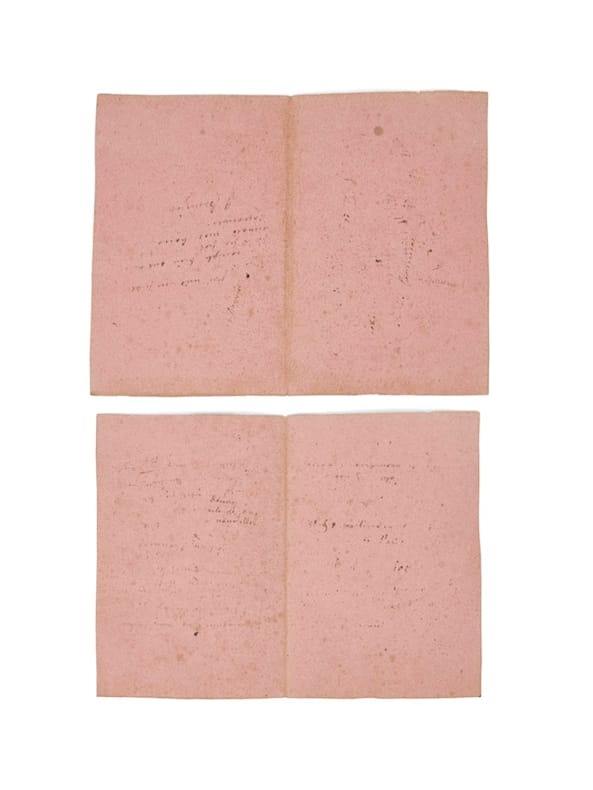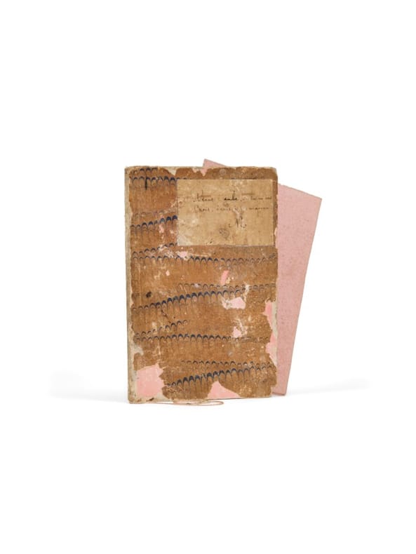 Deux vers du poète pour sa fille Geneviève S.l.n.d. [circa 1880]. Sous-main de carton (238 x 159 mm ouvert), recouvert de papier marbré, doublé de papier décor, étiquette contrecollée au premier plat, cahier de quatre feuillets de papier buvard rose. Deux vers autographes, signés, sur pièce de papier au premier plat : «Avant l'aube si tu m'en crois, écris à ta maman S.M.»