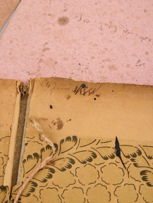 Émouvant objet personnel de la fille de Stéphane Mallarmé, née en 1864 : il contient plusieurs buvards roses, avec quelques décharges d'encre de son écriture soignée. On y déchiffre quelques bribes : « ... envoie mes bons souvenirs. G. Bonniot », « suis installée dans ce... », « Monsieur Delachaise, Avon », ainsi qu'une date sur la doublure : « 24 juin ». Ces deux vers de Stéphane Mallarmé resteront longtemps inédits, pour n'être publiés que dans Vers de circonstance, réunis et publiés en 1920 par Geneviève Mallarmé elle-même et Edmond Bonniot (le gendre du poète) : il rassemblent, dans ce recueil, tous les petits riens qui ont fait battre le pouls du quotidien de Stéphane Mallarmé sans avoir jamais publiés, des rassemblement de quatrains, distyques, rondelets, triolets et sonnets éparses qui témoignent de la tendresse et de la gaité du poète. Ils ont été composés entre 1880 et 1898, et celui-ci est sans doute l'un des plus anciens. Sa fille est alors âgée de seize ans. Nos deux vers sont à rapprocher de deux autres, également recueillis dans les mêmes Vers de circonstance : «Je souhaite que ce buvard Sous tes doigts devienne bavard». Cet objet a figuré à l'exposition Mallarmé du Musée d'Orsay, en 1998, et figure au catalogue sous le n° 186.