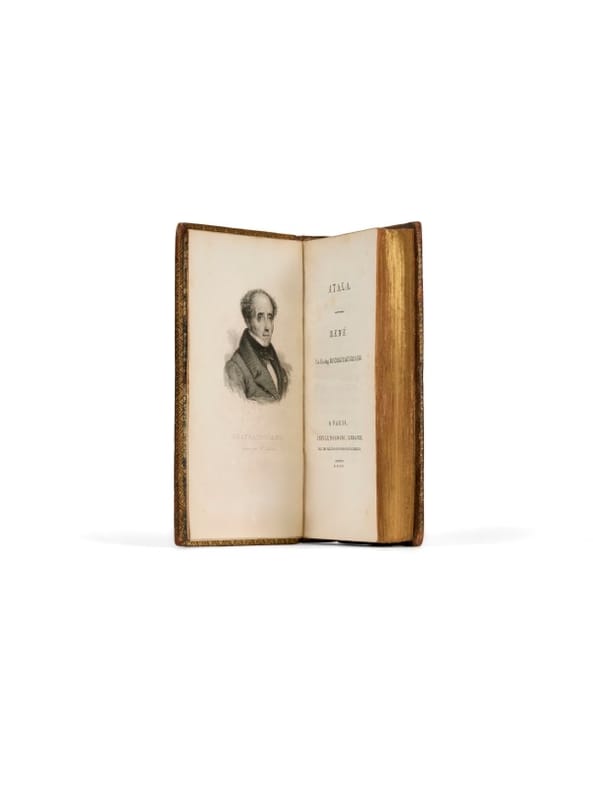 L'édition originale d'Atala, rare, parut en 1801 et René fut publié l'année suivante dans le Génie du christianisme. L'édition de 1805 réunit pour la première fois ces deux récits dans un volume illustré et comporte quarante-six pages de préface en édition originale, dans lesquelles Chateaubriand revient sur la genèse des textes, répond aux critiques et précise le cadre dans lequel ils doivent être lus. Chateaubriand avait commencé sa carrière littéraire en rapportant de son voyage en Amérique l'expérience des paysages et des peuples du Nouveau Monde. Parti de France en 1791, il affirma avoir parcouru les rives de l'Hudson jusqu'à Albany et les environs des chutes du Niagara, quête romantique du « bon sauvage » et de la solitude des forêts nord-américaines qui nourrit l'imaginaire d'Atala. Dès sa publication, le récit connut un succès immense et reste indissociable du célèbre tableau peint en 1808 par Anne-Louis Girodet, aujourd'hui conservé au Louvre, représentant la jeune héroïne morte, portée par Chactas et le père Aubry vers sa sépulture : une interprétation qui témoigne de l'immense retentissement du récit dans la culture du début du XIXᵉ siècle. Bon exemplaire en reliure d'époque, sur vélin. il est enrichi, pour Atala, de deux gravures supplémentaires, gravées par Amboise Tardieu, légendées en espagnol pour une édition que nous n'avons pu identifier.