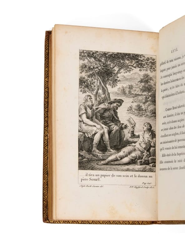 "Edition originale des deux ouvrages réunis. René parait ici pour la 1ère fois en édition séparée. Ouvrage illustré de 6 figures hors-texte de S.-B. Garnier, gravées par Saint-Aubin et Choffard." (Escoffier, 155). "Donne le texte définitif d'Atala (...)" (Clouzot, p. 62). Atala avait paru en 1801 sans l'autorisation de l'auteur, et René, avait paru pour la première fois dans l'édition originale du Génie du Christianisme en 1802.