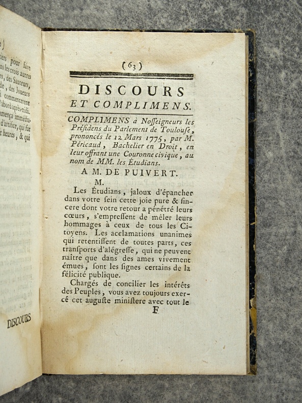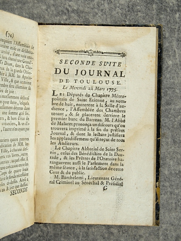 TOULOUSE. SANS NOM D’EDITEUR. 1775. IN-12 (11 X 17 X 1 CENTIMETRES ENVIRON) DE 167 PAGES, RELIURE MODESTE A LA BRADEL CARTONNAGE BRUN. CONTIENT 3 PARTIES, SUR 6 PARUES ET PUBLIEES SEPAREMENT (VOIR EXEMPLAIRE DETENU PAR LA B. M. DE TOULOUSE). RARE. TRACES DE MOUILLURE ANCIENNE SUR CERTAINES PAGES, SINON ASSEZ BON EXEMPLAIRE.