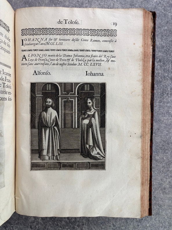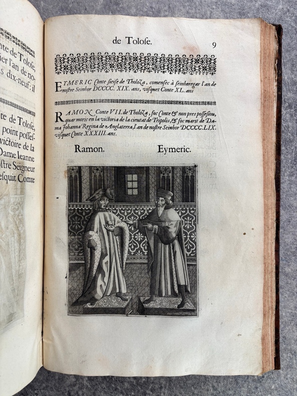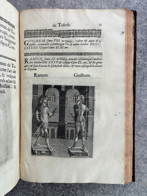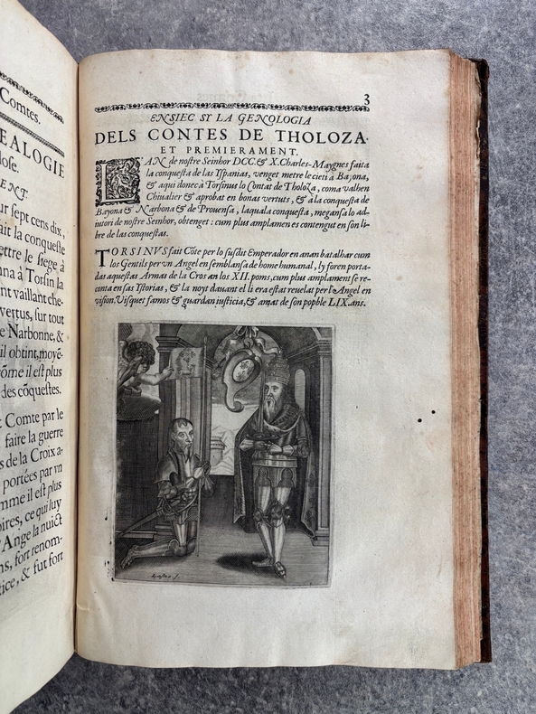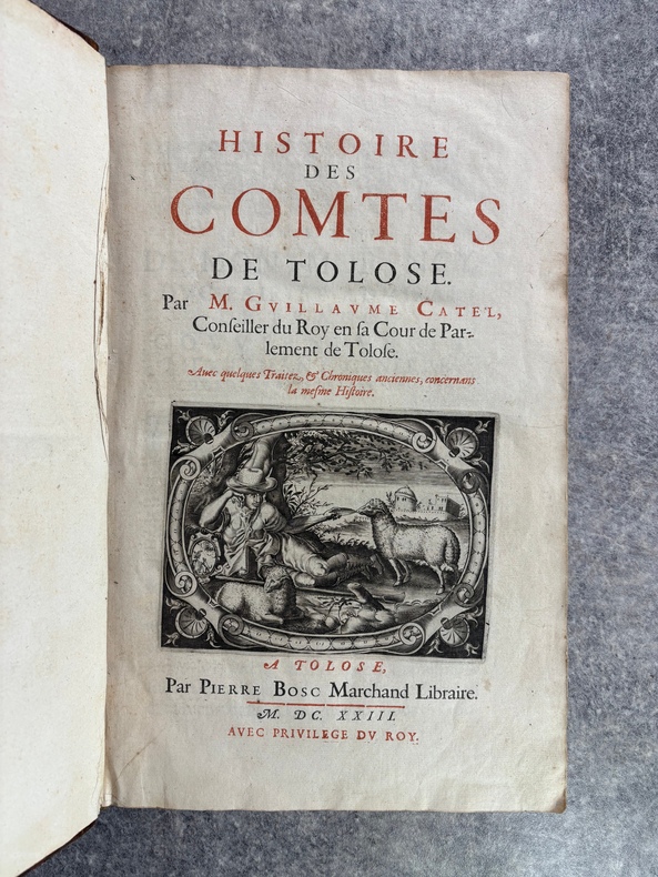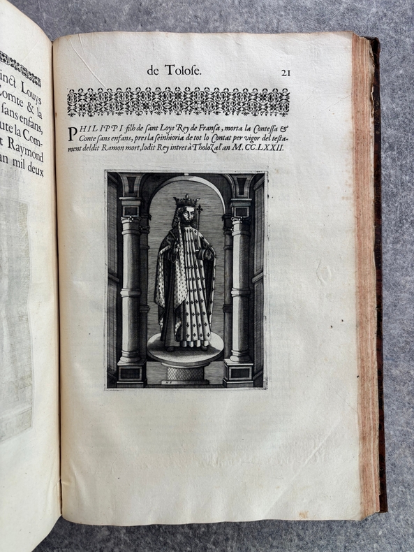 A TOLOSE. PAR PIERRE BOSC, MARCHAND LIBRAIRE. 1623. IN-FOLIO (24 X 36 CENTIMETRES ENVIRON) DE (12) + 400 + (44) ET 174 PAGES, RELIURE D'EPOQUE PLEIN VEAU, DOS A SIX NERFS ORNE DE CAISSONS A FLEURONS DORES, TITRE DORE SUR ETIQUETTE MAROQUIN HAVANE, TRANCHES ROUGES. ILLUSTRE DE 10 GRANDS PORTRAITS A MI-PAGE GRAVES AU BURIN PAR J. E. LANE ET HUGUET. (BRUNET 24732 ET SAFFROY. III. 51020). ERREUR DE PAGINATION D'ORIGINE, LES PAGES 31 A 36 N'EXISTANT PAS. (ON PASSE DIRECTEMENT DU FEUILLET Bbb2 AU FEUILLET Bbb4, AVEC UN TITRE INTERCALAIRE A3 EN LIEU DU Bbb3). QUELQUES DEFAUTS EXTERIEURS, PETITE GALERIE DE VER ANCIENNE EN MARGE DE QUELQUES PAGES, SANS ATTEINTE AU TEXTE, SINON BON EXEMPLAIRE DE CET OUVRAGE RARE ET RECHERCHE.