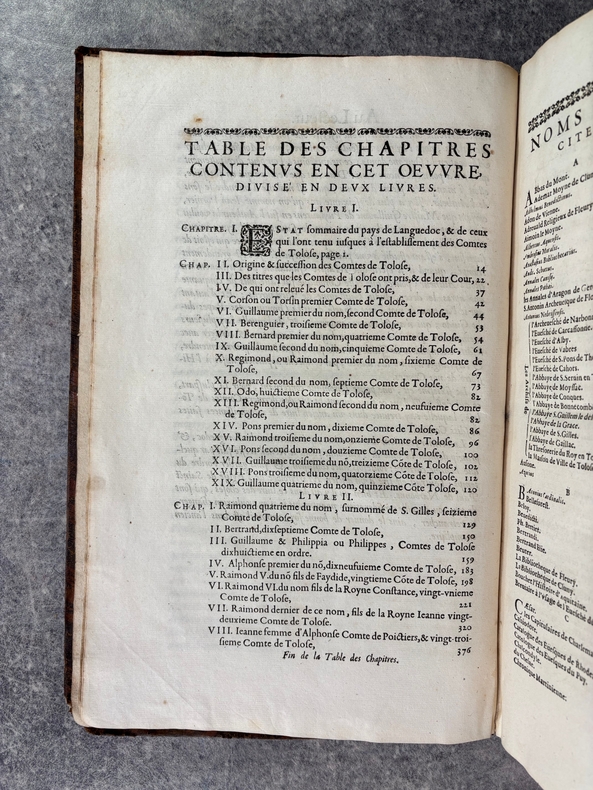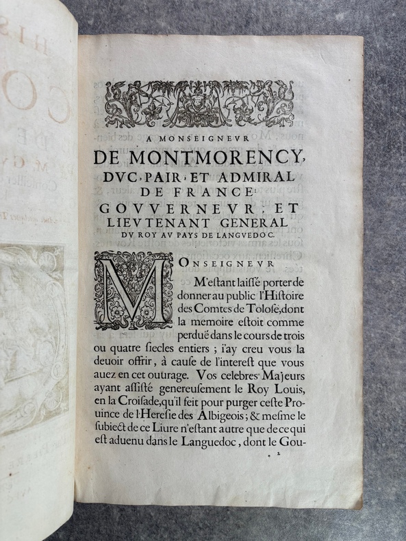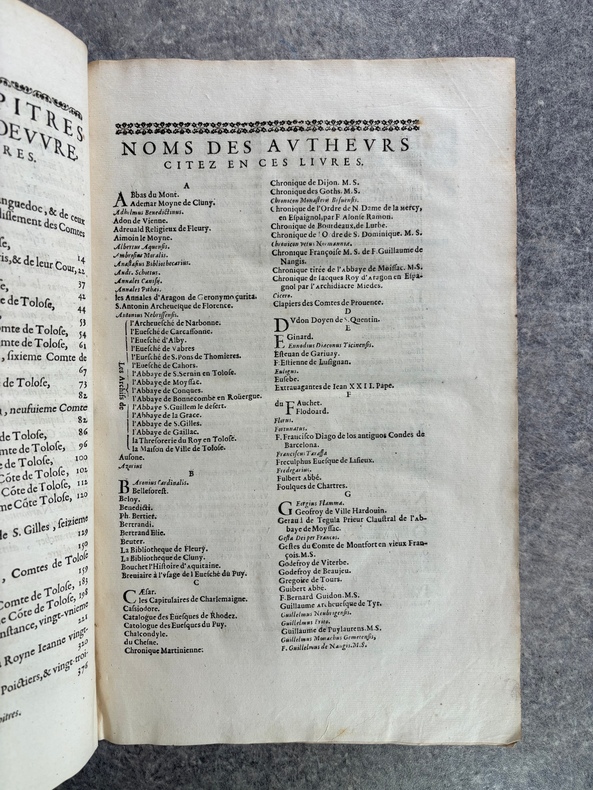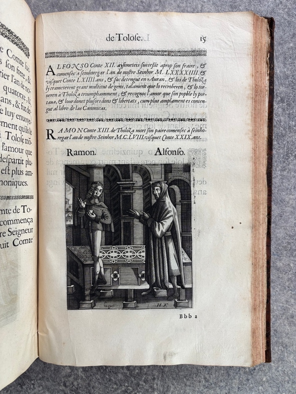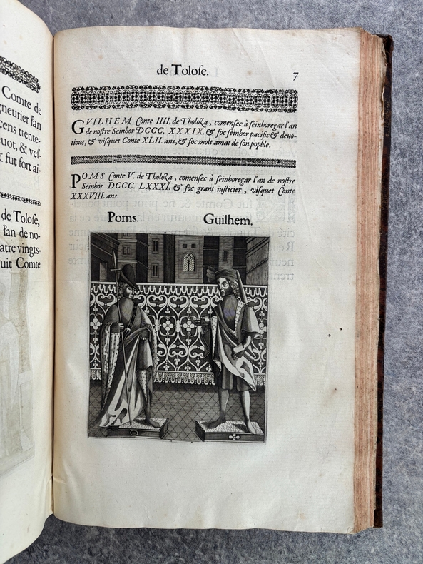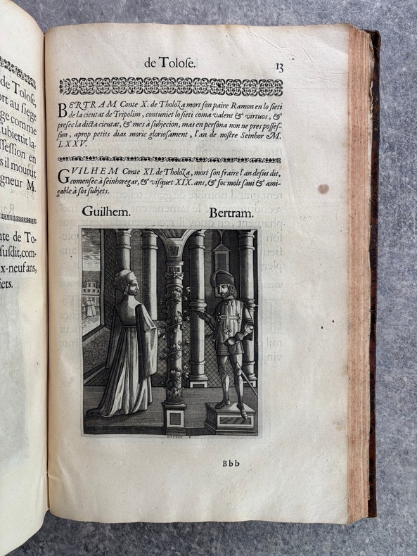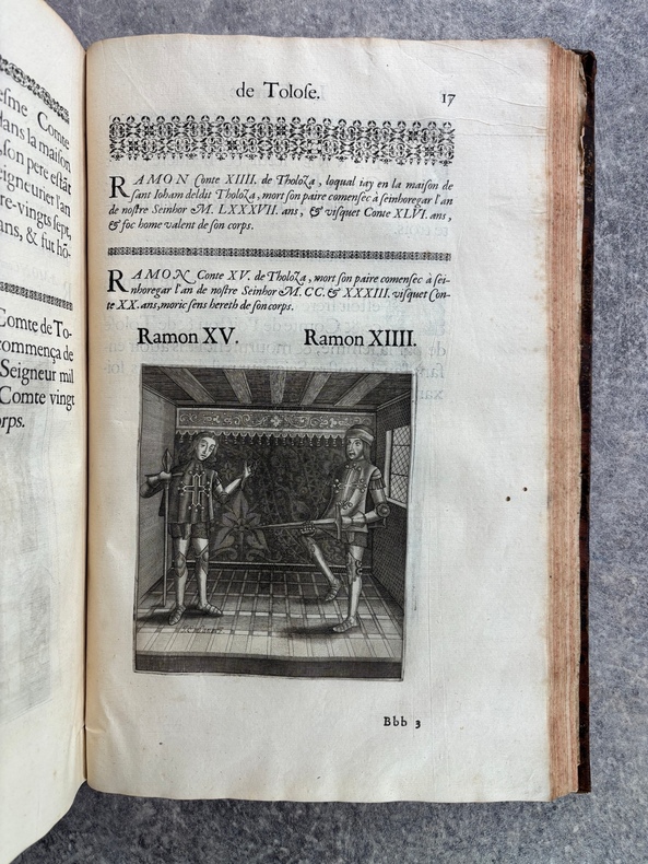 A TOLOSE. PAR PIERRE BOSC, MARCHAND LIBRAIRE. 1623. IN-FOLIO (24 X 36 CENTIMETRES ENVIRON) DE (12) + 400 + (44) ET 174 PAGES, RELIURE D'EPOQUE PLEIN VEAU, DOS A SIX NERFS ORNE DE CAISSONS A FLEURONS DORES, TITRE DORE SUR ETIQUETTE MAROQUIN HAVANE, TRANCHES ROUGES. ILLUSTRE DE 10 GRANDS PORTRAITS A MI-PAGE GRAVES AU BURIN PAR J. E. LANE ET HUGUET. (BRUNET 24732 ET SAFFROY. III. 51020). ERREUR DE PAGINATION D'ORIGINE, LES PAGES 31 A 36 N'EXISTANT PAS. (ON PASSE DIRECTEMENT DU FEUILLET Bbb2 AU FEUILLET Bbb4, AVEC UN TITRE INTERCALAIRE A3 EN LIEU DU Bbb3). QUELQUES DEFAUTS EXTERIEURS, PETITE GALERIE DE VER ANCIENNE EN MARGE DE QUELQUES PAGES, SANS ATTEINTE AU TEXTE, SINON BON EXEMPLAIRE DE CET OUVRAGE RARE ET RECHERCHE.