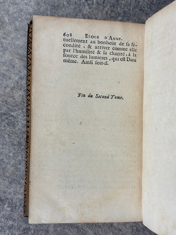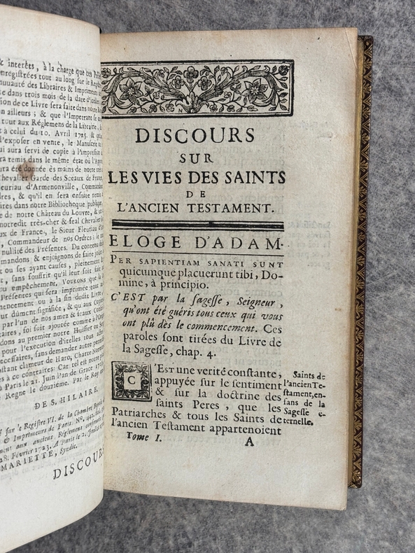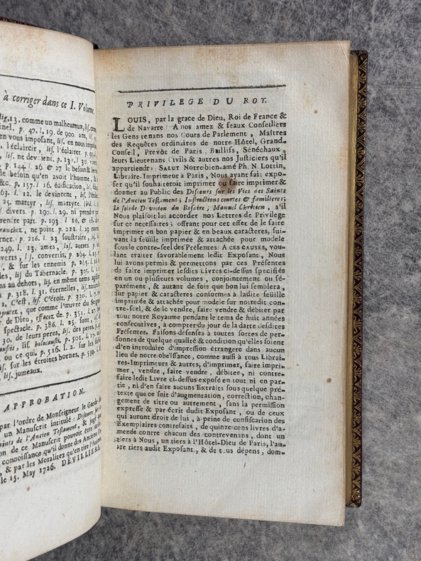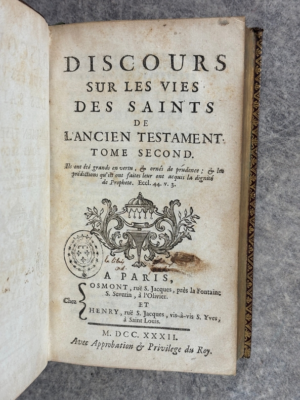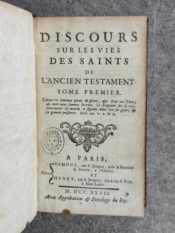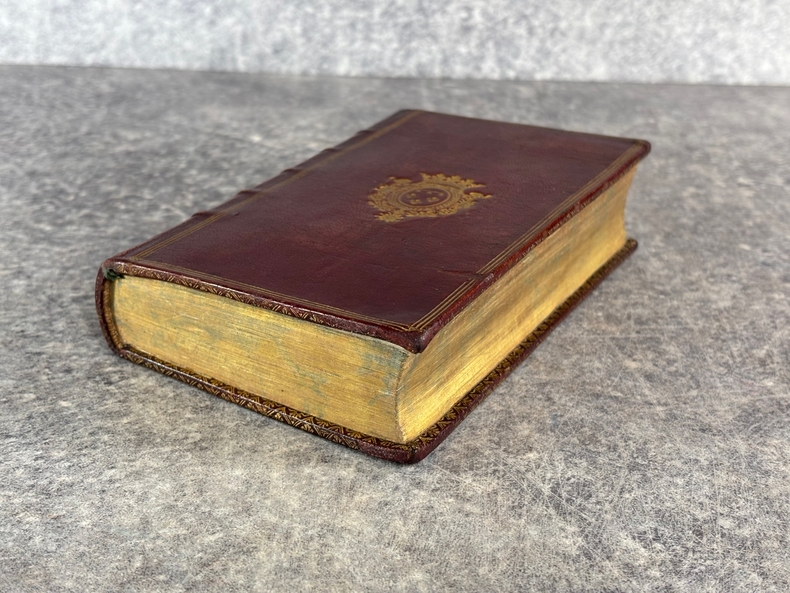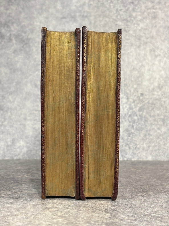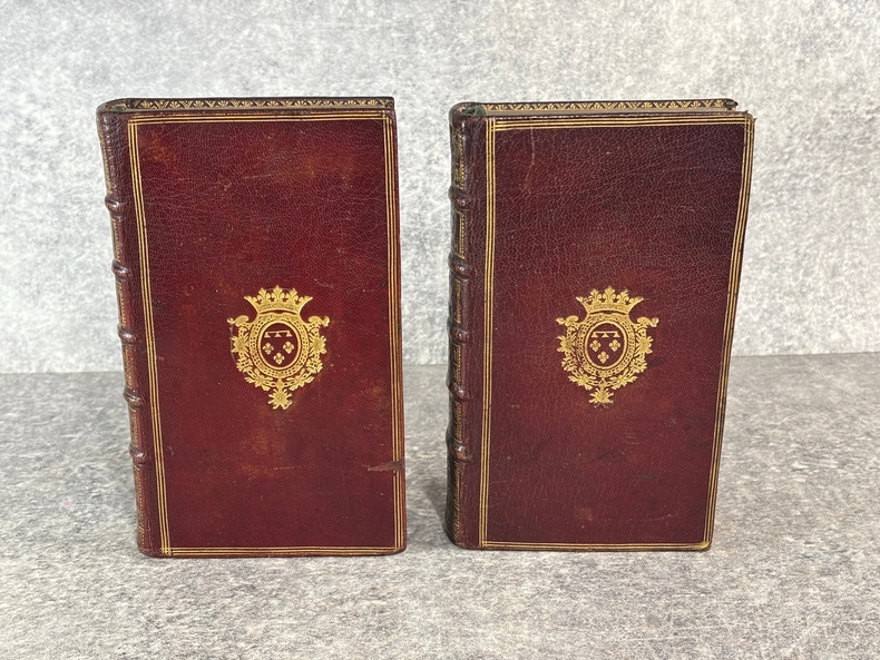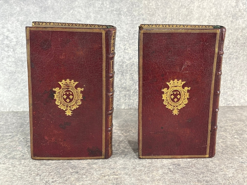 A PARIS. OSMONT ET HENRY. 1732. TOMES PREMIER ET SECOND SEULS, 2/6 VOLUMES IN-12 (10,5 X 17 X 6,5 CENTIMETRES ENVIRON) DE (2) + XXI + (15) + 542 ET (14) + 608 PAGES, RELIURE D'EPOQUE PLEIN MAROQUIN ROUGE, DOS A CINQ NERFS ORNE DE CAISSONS A FLEURONS DORES, TITRE DORE, TRANCHES MARBREES SOUS DORURE, TRIPLE FILET DORE ENCADRANT LES PLATS, ROULETTE INTERIEURE DOREE. AUX ARMES DOREES SANS DOUTE DE LOUIS-PHILIPPE 1° DUC D’ORLEANS, 1° PRINCE DU SANG (1725-1785). FER SIMILAIRE CHEZ O.H.R. PLANCHE 2572. CACHET EX-LIBRIS DU DUC D’ORLEANS SUR LE FEUILLET DE TITRE DANS CHACUN DES VOLUMES. EX-LIBRIS MANUSCRIT DANS LE SECOND VOLUME, AVEC PETIT MANQUE DE PAPIER SANS GRAVITE SUR LE FEUILLET DE TITRE. QUELQUES PETITS DEFAUTS EXTERIEURS SANS GRAVITE, SINON BEL EXEMPLAIRE.