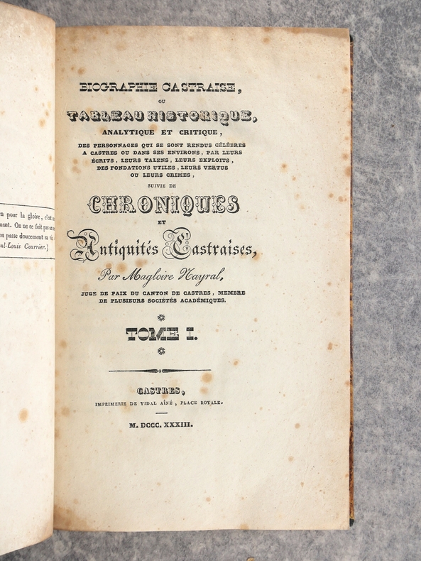 CASTRES. IMPRIMERIE DE VIDAL AINE. 1833-1837. 4 VOLUMES IN-8 (13,5 X 21 X 15 CENTIMETRES ENVIRON) DE XVI + 352, 512, 612 ET 648 PAGES, RELIURE D'EPOQUE 1/2 VEAU HAVANE, DOS A QUATRE LEGERS NERFS, TITRE DORE SUR ETIQUETTE MAROQUIN ROUGE. ENVOI MANUSCRIT AUTOGRAPHE SIGNE DE L'AUTEUR AU COLONEL DUPUY. AVEC UN POEME DE 4 PAGES: «LA NAISSANCE D'UN PRINCE» PAR MAGLOIRE NAYRAL, JUGE DE PAIX A CASTRES. CASTRES. IMP. DE VEUVE GRILLON. 17 MARS 1856. OUVRAGE RARE COMPLET (BRUNET. 24748). PETITS DEFAUTS EXTERIEURS, DONT CHARNIERE DU PLAT INFERIEUR DU TOME 3, SINON TRES BEL EXEMPLAIRE.