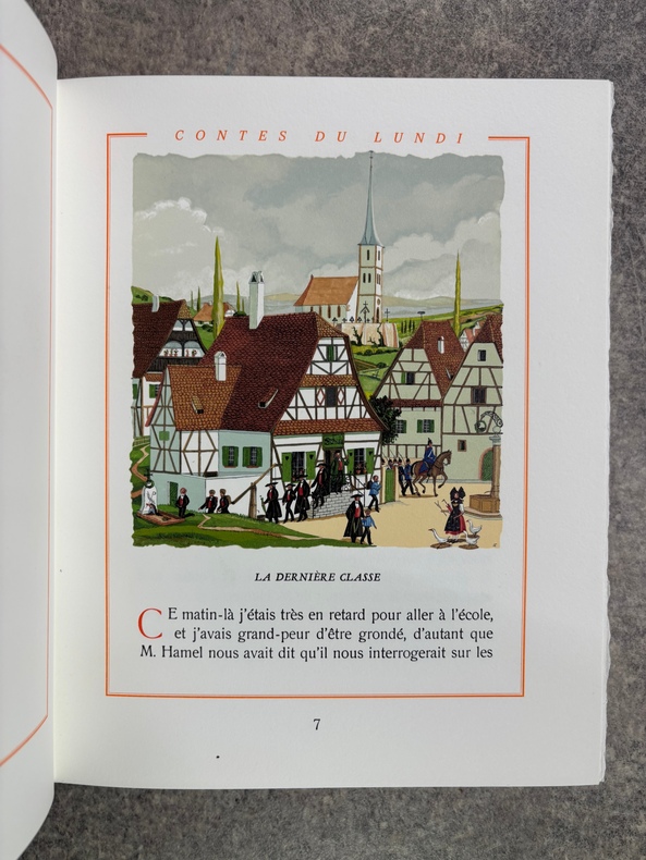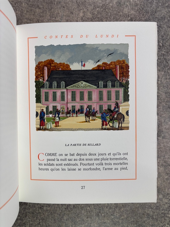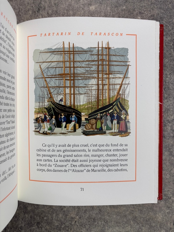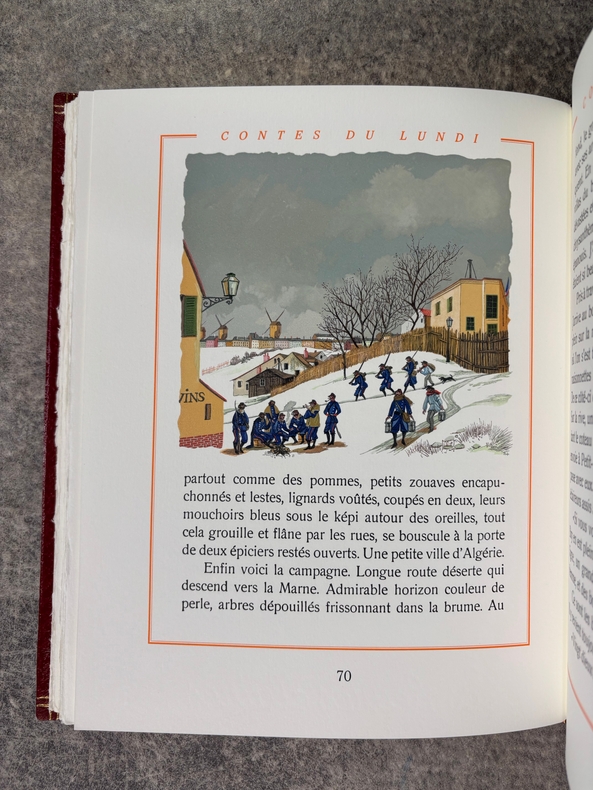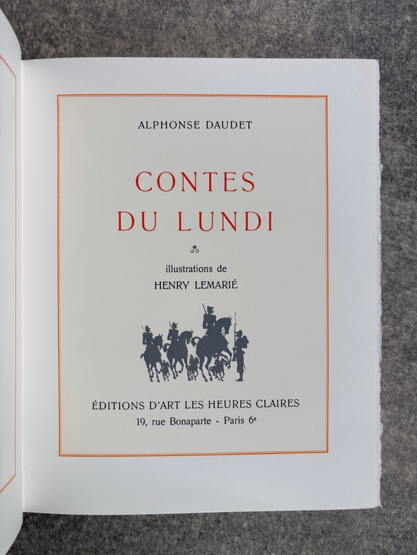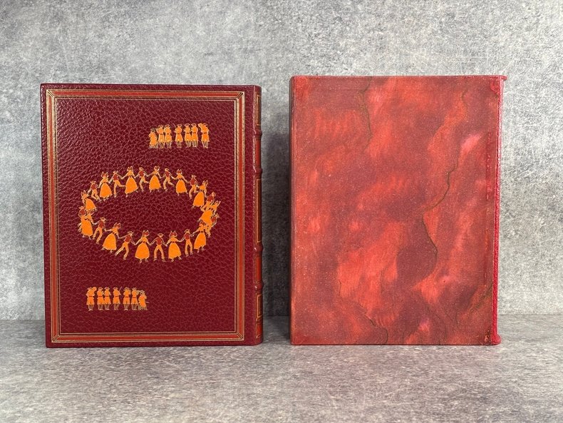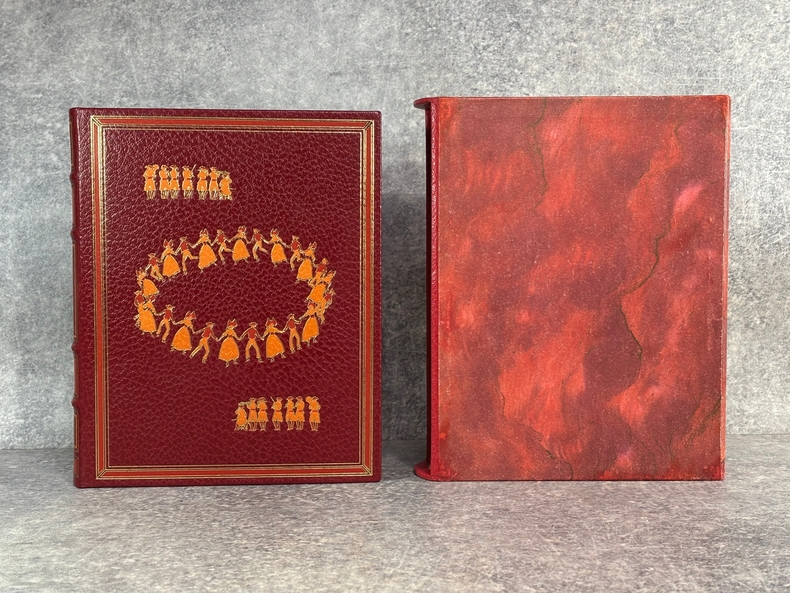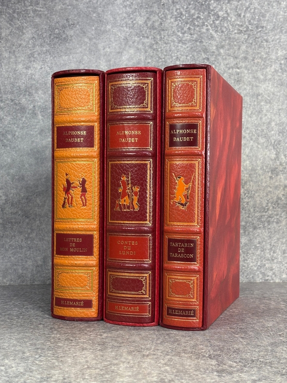 PARIS 6°. EDITIONS D'ART LES HEURES CLAIRES. 1977-1981. 3 TOMES EN 3 VOLUMES PETIT IN-4 (20,5 X 25,5 X 17 CENTIMETRES ENVIRON) DE 267 + 245 ET 189 PAGES, RELIURE DE L'EDITEUR A LA BRADEL PLEIN MAROQUIN MOSAIQUE ROUGE, TITRE ET TETE DORES, SOUS ETUI BORDE. ILLUSTRE DE 48 BELLES MINIATURES GRAVEES SUR BOIS EN COULEURS ET DE 66 VIGNETTES TIREES EN GRIS. PREMIER TIRAGE, LIMITE A 3650 EXEMPLAIRES NUMEROTES, TOUS SUR GRAND VELIN DE RIVES. UN DES 2952 COMPORTANT LES ILLUSTRATIONS DANS LEUR ETAT DEFINITIF, CELUI-CI PORTANT LE NUMERO 939. PETITS DEFAUTS SANS GRAVITE SUR LES ETUIS, DONT INFIME MANQUE DE PAPIER ET PETIT COUP A UN COIN SUR L’ETUI DES CONTES DU LUNIDI, SINON BEL EXEMPLAIRE.