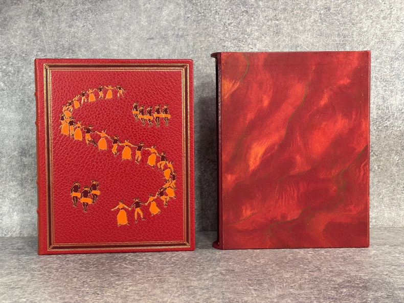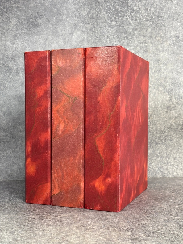 PARIS 6°. EDITIONS D'ART LES HEURES CLAIRES. 1977-1981. 3 TOMES EN 3 VOLUMES PETIT IN-4 (20,5 X 25,5 X 17 CENTIMETRES ENVIRON) DE 267 + 245 ET 189 PAGES, RELIURE DE L'EDITEUR A LA BRADEL PLEIN MAROQUIN MOSAIQUE ROUGE, ROUGE FONCE ET ORANGE, TITRE ET TETE DORES, SOUS ETUI BORDE. ILLUSTRE DE 48 BELLES MINIATURES GRAVEES SUR BOIS EN COULEURS ET DE 66 VIGNETTES TIREES EN GRIS. PREMIER TIRAGE, LIMITE A 3650 EXEMPLAIRES NUMEROTES, TOUS SUR GRAND VELIN DE RIVES. UN DES 2952 COMPORTANT LES ILLUSTRATIONS DANS LEUR ETAT DEFINITIF, CELUI-CI PORTANT LE NUMERO 3529. PETITES TRACES DE FROTTEMENT SUR UN ETUI, SINON BEL EXEMPLAIRE.