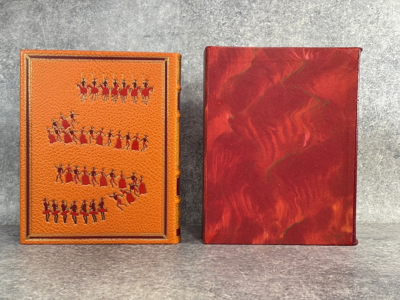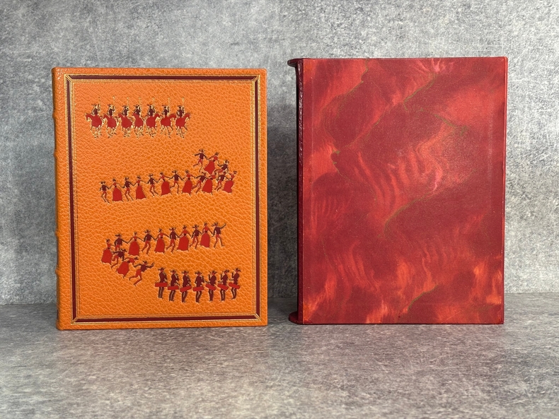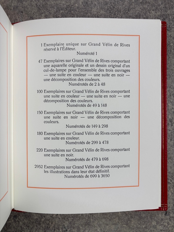 PARIS 6°. EDITIONS D'ART LES HEURES CLAIRES. 1977-1981. 3 TOMES EN 3 VOLUMES PETIT IN-4 (20,5 X 25,5 X 17 CENTIMETRES ENVIRON) DE 267 + 245 ET 189 PAGES, RELIURE DE L'EDITEUR A LA BRADEL PLEIN MAROQUIN MOSAIQUE ROUGE, ROUGE FONCE ET ORANGE, TITRE ET TETE DORES, SOUS ETUI BORDE. ILLUSTRE DE 48 BELLES MINIATURES GRAVEES SUR BOIS EN COULEURS ET DE 66 VIGNETTES TIREES EN GRIS. PREMIER TIRAGE, LIMITE A 3650 EXEMPLAIRES NUMEROTES, TOUS SUR GRAND VELIN DE RIVES. UN DES 2952 COMPORTANT LES ILLUSTRATIONS DANS LEUR ETAT DEFINITIF, CELUI-CI PORTANT LE NUMERO 2579. PETITES TRACES DE FROTTEMENT SUR LES ETUIS CARTONNES, SANS AUCUNE GRAVITE, SINON BEL EXEMPLAIRE.