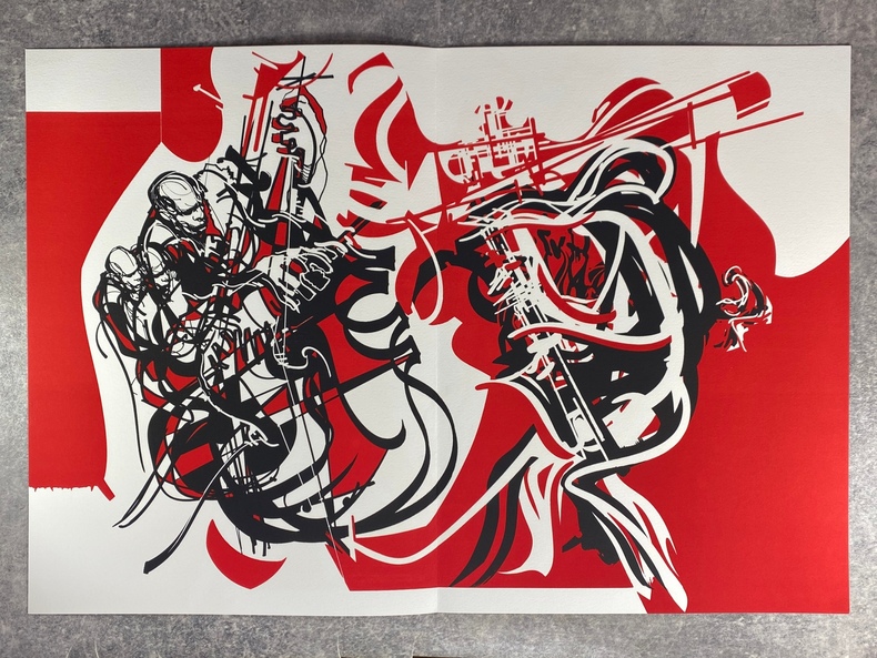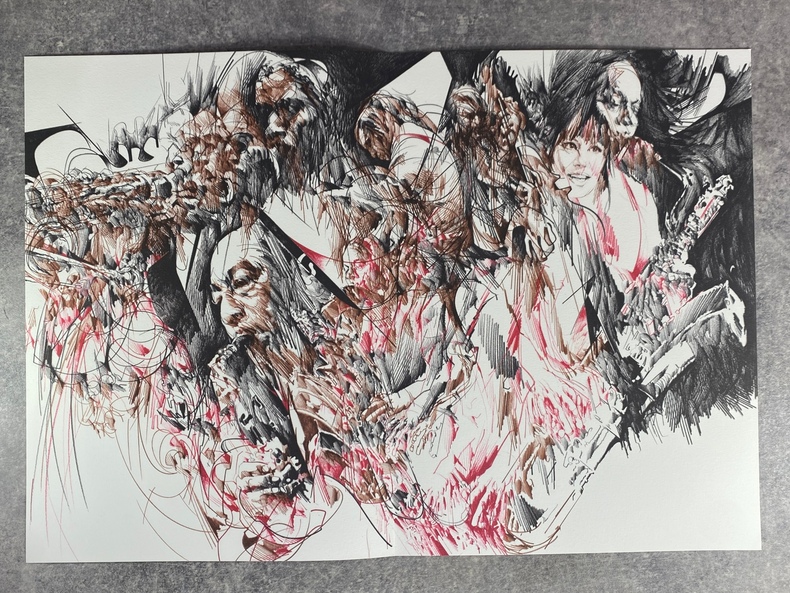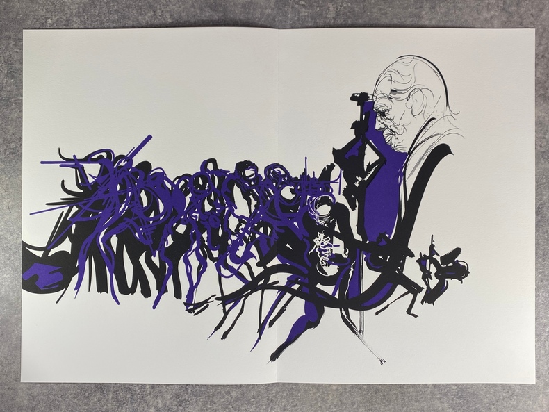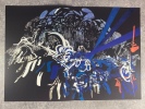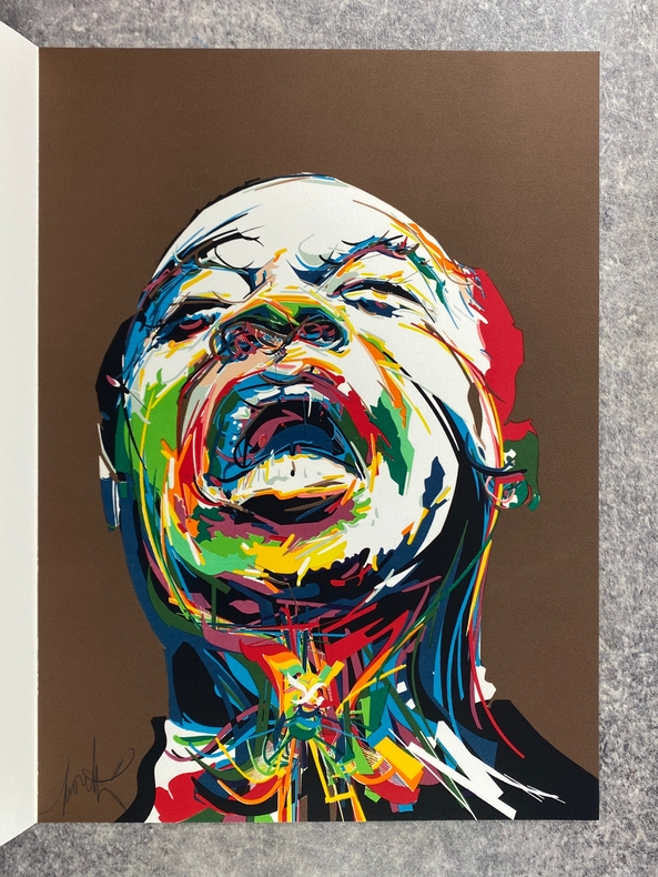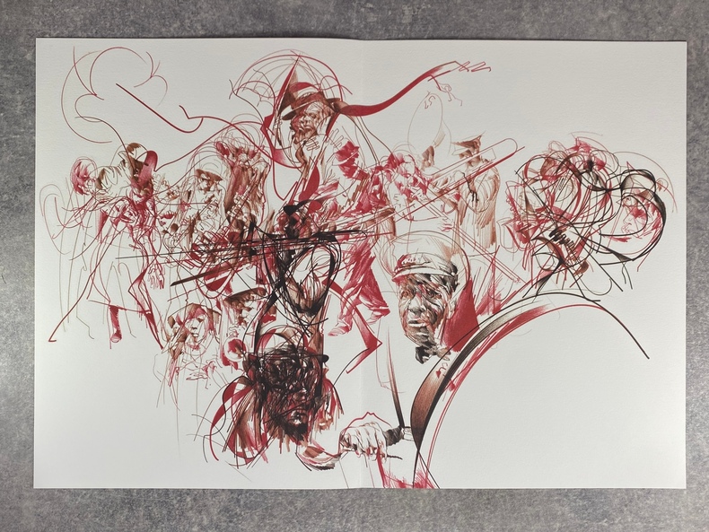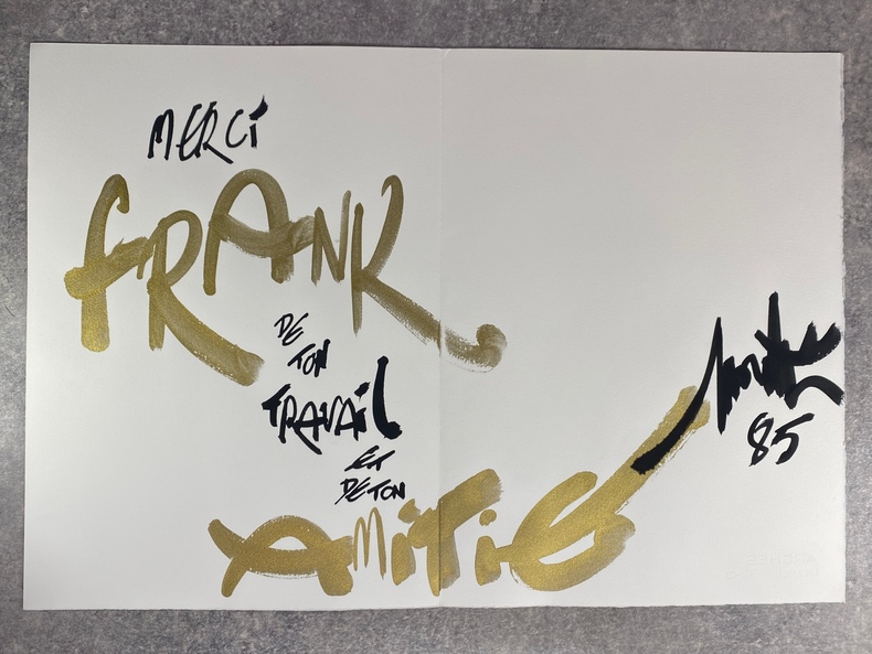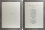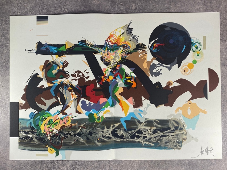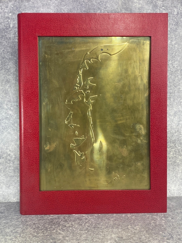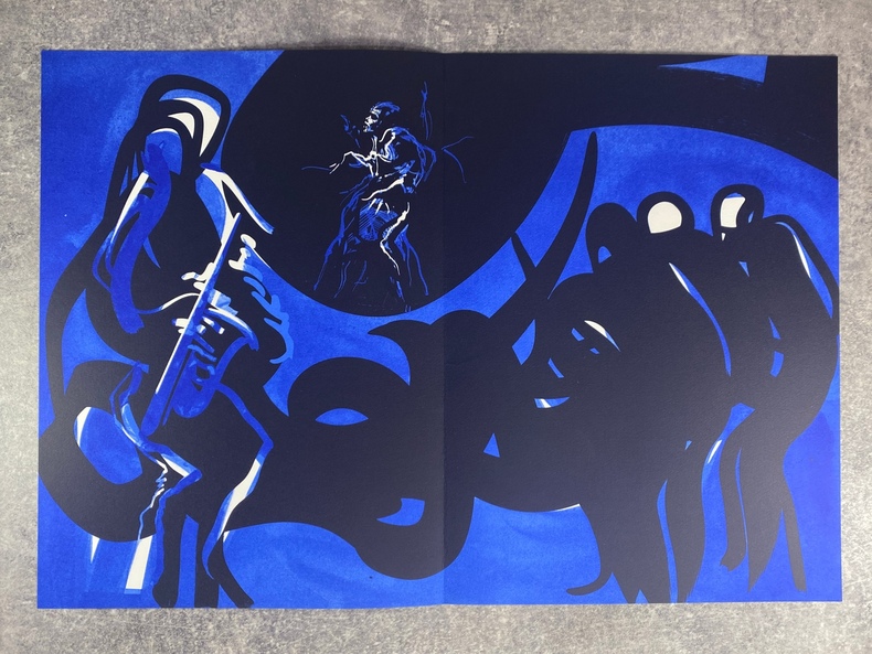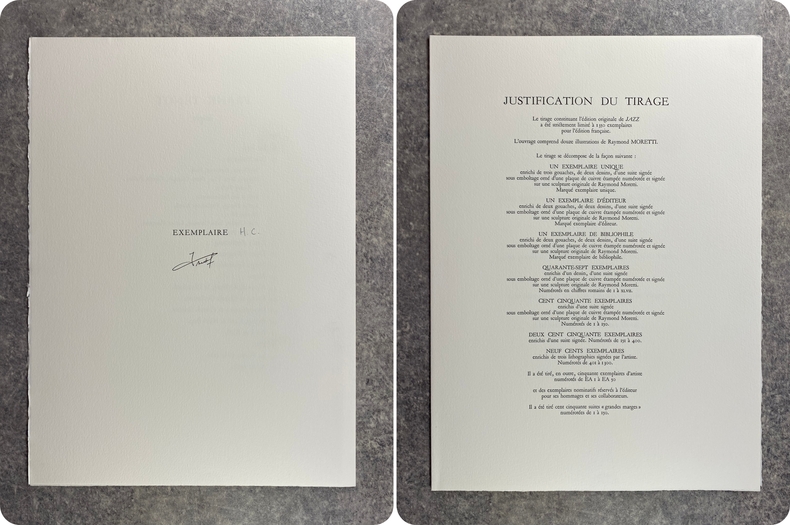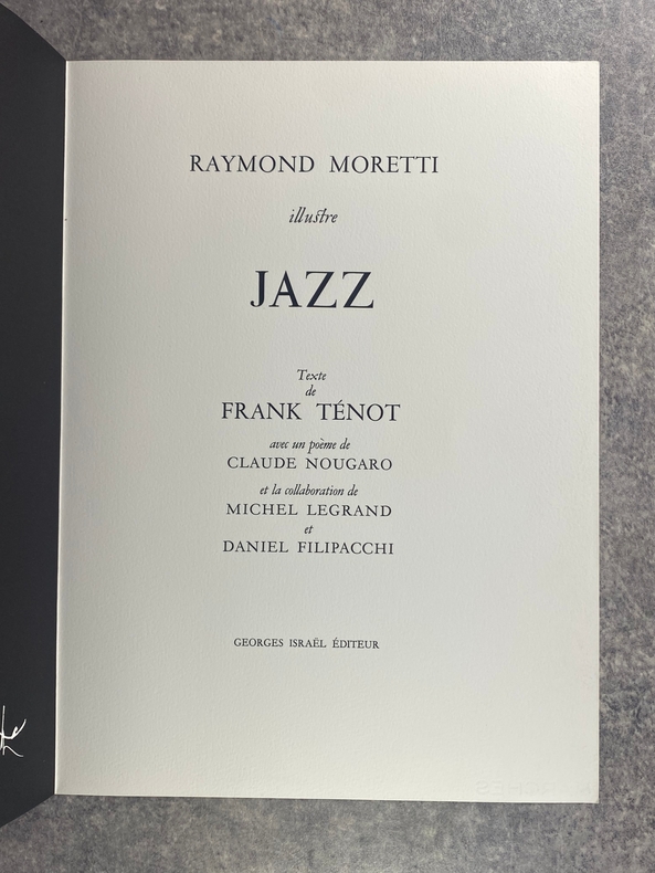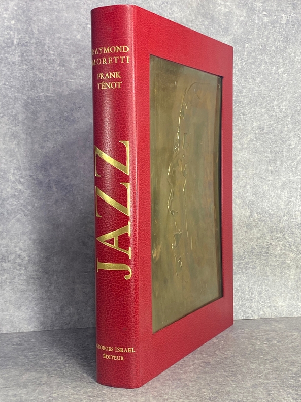 PARIS. GEORGES ISRAEL EDITEUR. 1983. IN-FOLIO (35,5 X 47,5 X 6 CENTIMETRES ENVIRON) DE 56 + (7) PAGES, SOUS COUVERTURE CARTONNEE BLANCHE ILLUSTREE EN DORE ET EMBOITAGE CARTONNE ROUGE DE L'EDITEUR, PLAT SUPERIEUR ILLUSTRE EN DORE, TITRE DORE SUR DOS LISSE. ILLUSTRE DE 13 LITHOGRAPHIES HORS TEXTE : UNE EN NOIR EN FRONTISPICE ET 12 EN COULEURS, DONT 11 A DOUBLE PAGE. AVEC 3 LITHOGRAPHIES SIGNEES AU CRAYON PAR RAYMOND MORETTI, 2 DOUBLES ET UNE SIMPLE (PAGES 12-13, 16-17 ET 35). PREMIER TIRAGE LIMITE A 1350 EXEMPLAIRES NUMEROTES, TOUS SUR VELIN PUR CHIFFON DES PAPETERIES D'ARCHES, CELUI-CI H. C., JUSTIFIE A LA MAIN ET SIGNE PAR L'EDITEUR. ENRICHI D’UN TRES BEL ENVOI CALLIGRAPHIE PAR L’ARTISTE, ADRESSE A FRANK TENOT ET TENANT TOUTE LA DOUBLE PAGE BLANCHE EN TETE DE L’OUVRAGE, EN NOIR ET EN DORE : « MERCI FRANK DE TON TRAVAIL ET DE TON AMITIE. MORETTI 85 ». ON JOINT UNE PLAQUE EN CUIVRE AVEC LE PROFIL DE LOUIS AMSTRONG PAR MORETTI (27,5 X 37 CENTIMETRES ENVIRON). PETIT DEFAUT A L’EMBOITAGE, SINON BEL ENSEMBLE.