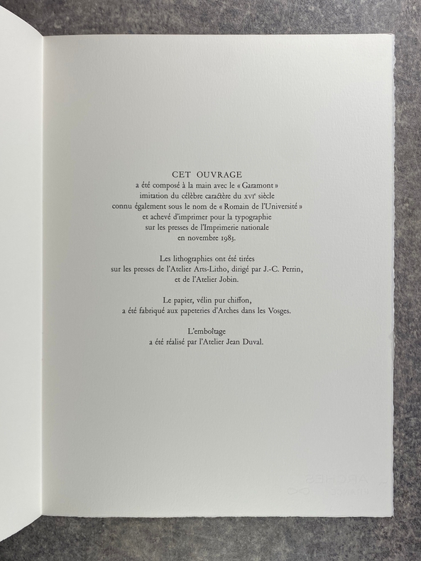 PARIS. GEORGES ISRAEL EDITEUR. 1983. IN-FOLIO (35,5 X 47,5 X 6 CENTIMETRES ENVIRON) DE 56 + (7) PAGES, SOUS COUVERTURE CARTONNEE BLANCHE ILLUSTREE EN DORE ET EMBOITAGE CARTONNE ROUGE DE L'EDITEUR, PLAT SUPERIEUR ILLUSTRE EN DORE, TITRE DORE SUR DOS LISSE. ILLUSTRE DE 13 LITHOGRAPHIES HORS TEXTE : UNE EN NOIR EN FRONTISPICE ET 12 EN COULEURS, DONT 11 A DOUBLE PAGE. PREMIER TIRAGE LIMITE A 1350 EXEMPLAIRES NUMEROTES, TOUS SUR VELIN PUR CHIFFON DES PAPETERIES D'ARCHES, CELUI-CI NON JUSTIFIE. BON EXEMPLAIRE.