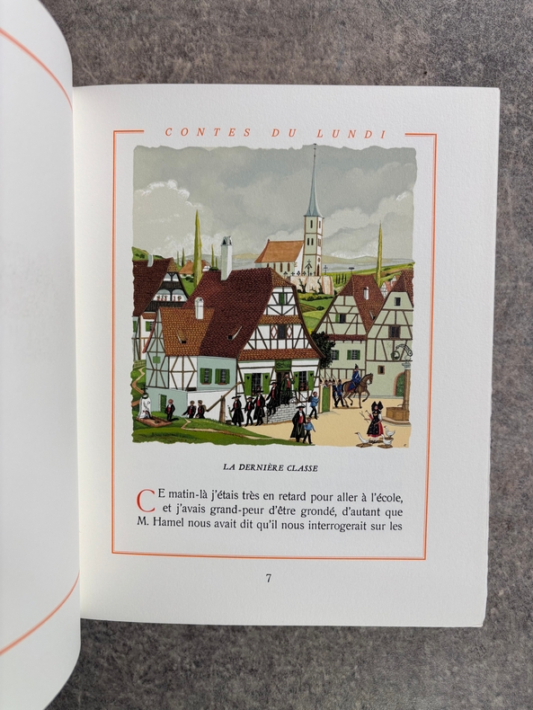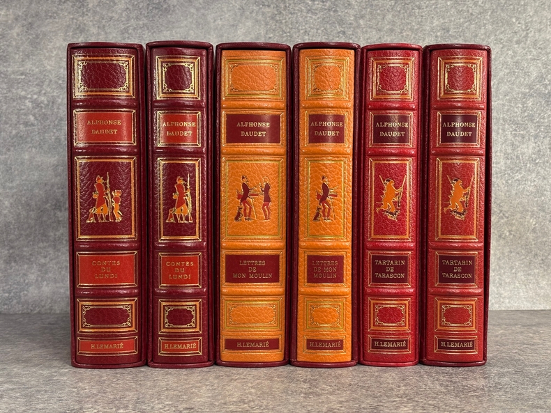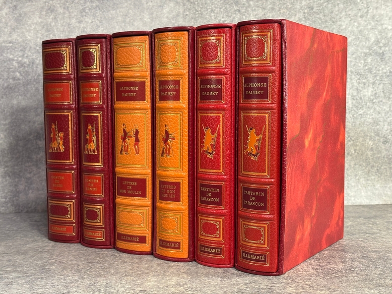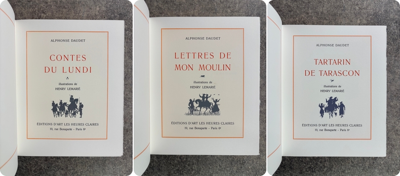 PARIS 6°. EDITIONS D'ART LES HEURES CLAIRES. 1977-1981. 3 TOMES EN 3 VOLUMES PETIT IN-4 (20,5 X 25,5 X 17 CENTIMETRES ENVIRON) DE 267 + 245 ET 189 PAGES, RELIURE DE L'EDITEUR A LA BRADEL PLEIN MAROQUIN MOSAIQUE ROUGE, TITRE ET TETE DORES, SOUS ETUI BORDE. ILLUSTRE DE 48 BELLES MINIATURES GRAVEES SUR BOIS EN COULEURS ET DE 66 VIGNETTES TIREES EN GRIS. PREMIER TIRAGE, LIMITE A 3650 EXEMPLAIRES NUMEROTES, TOUS SUR GRAND VELIN DE RIVES. UN DES 2952 COMPORTANT LES ILLUSTRATIONS DANS LEUR ETAT DEFINITIF, CELUI-CI PORTANT LE NUMERO 939. PETITS DEFAUTS SANS GRAVITE SUR LES ETUIS, DONT INFIME MANQUE DE PAPIER ET PETIT COUP A UN COIN SUR L’ETUI DES CONTES DU LUNIDI, SINON BEL EXEMPLAIRE.