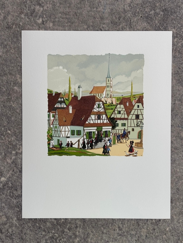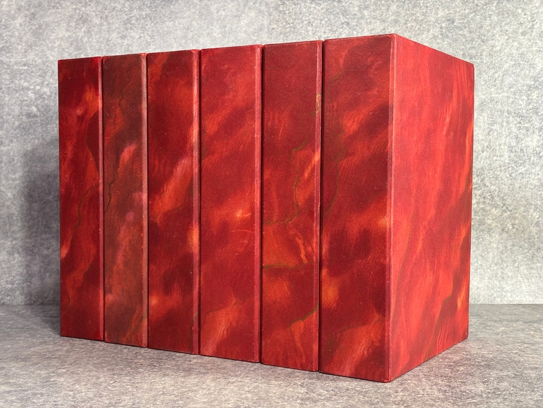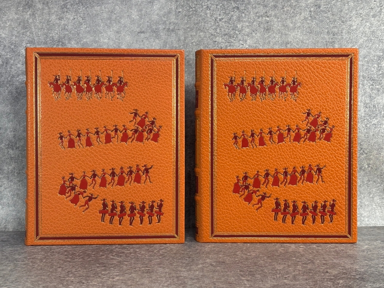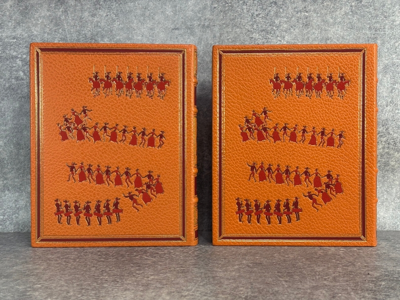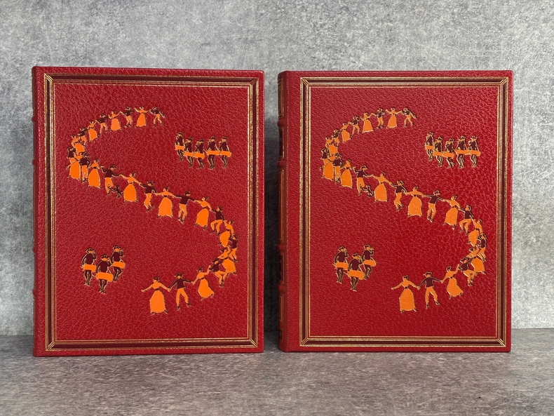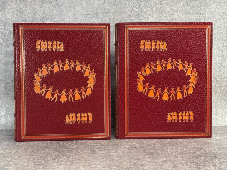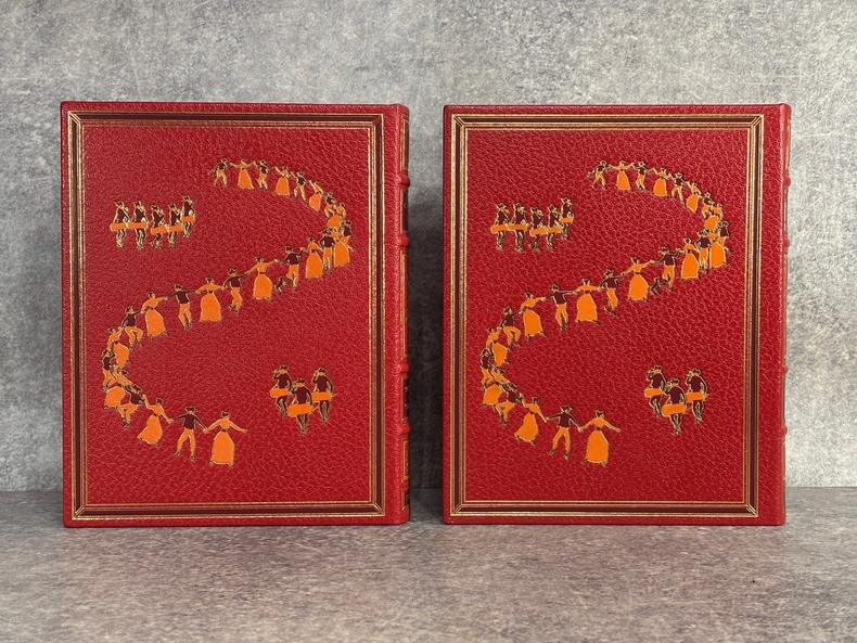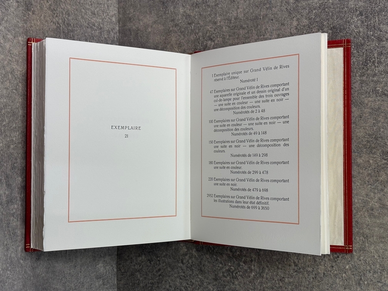 PARIS 6°. EDITIONS D'ART LES HEURES CLAIRES. 1977-1981. 3 TOMES EN 6 VOLUMES PETIT IN-4 (20,5 X 25,5 X 33 CENTIMETRES ENVIRON) DE 267 + 245 ET 189 PAGES, COMPRENANT 3 VOLUMES DE TEXTE ET 3 VOLUMES DE SUITE, RELIURE DE L'EDITEUR A LA BRADEL PLEIN MAROQUIN MOSAIQUE ROUGE, ROUGE FONCE ET ORANGE, TITRE ET TETE DORES, SOUS ETUI BORDE. ILLUSTRE DE 48 BELLES MINIATURES GRAVEES SUR BOIS EN COULEURS ET DE 66 VIGNETTES TIREES EN GRIS. PREMIER TIRAGE, LIMITE A 3650 EXEMPLAIRES NUMEROTES, TOUS SUR GRAND VELIN DE RIVES. UN DES 47 COMPORTANT UNE AQUARELLE ORIGINALE ET UN DESSIN ORIGINAL D’UN CUL-DE-LAMPE POUR L’ENSEMBLE DES 3 OUVRAGES, AVEC UNE SUITE EN COULEURS, UNE SUITE EN NOIR, UNE DECOMPOSITION DES COULEURS, CELUI-CI PORTANT LE NUMERO 21. BEL EXEMPLAIRE.