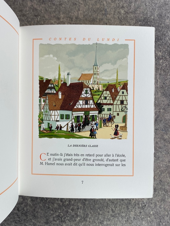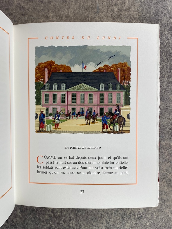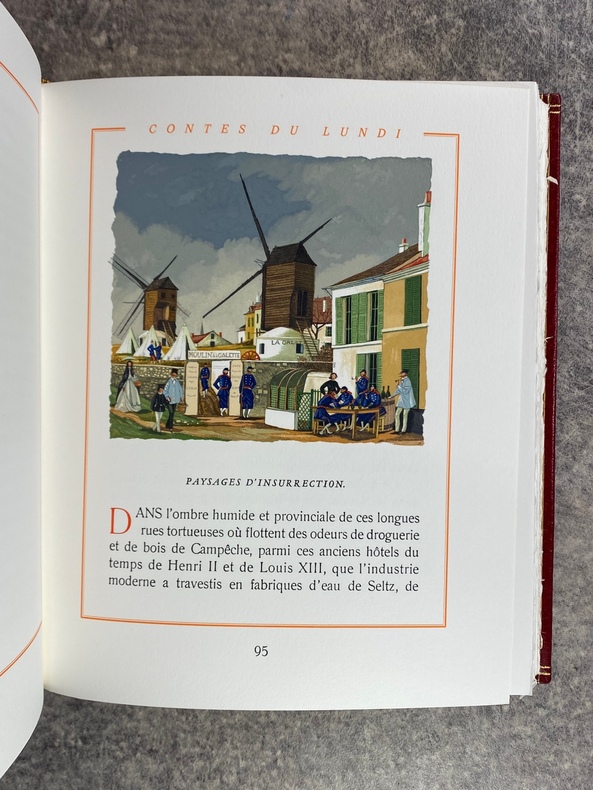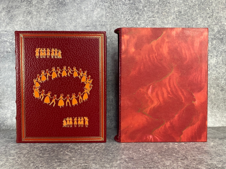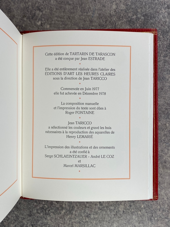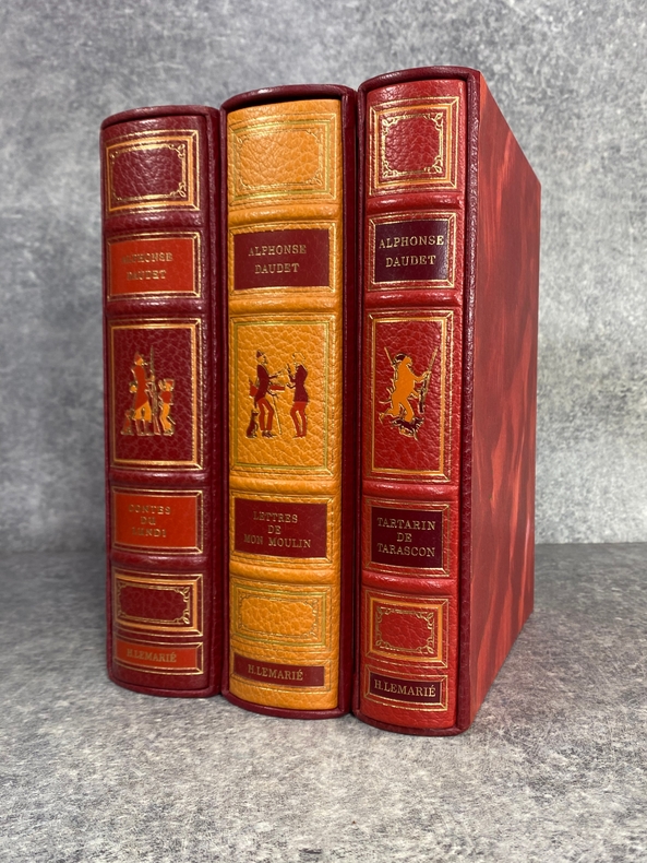 PARIS 6°. EDITIONS D'ART LES HEURES CLAIRES. 1977-1981. 3 TOMES EN 3 VOLUMES PETIT IN-4 (20,5 X 25,5 X 17 CENTIMETRES ENVIRON) DE 267 + 245 ET 189 PAGES, RELIURE DE L'EDITEUR A LA BRADEL PLEIN MAROQUIN MOSAIQUE ROUGE, TITRE ET TETE DORES, SOUS ETUI BORDE. ILLUSTRE DE 48 BELLES MINIATURES GRAVEES SUR BOIS EN COULEURS ET DE 66 VIGNETTES TIREES EN GRIS. PREMIER TIRAGE, LIMITE A 3650 EXEMPLAIRES NUMEROTES, TOUS SUR GRAND VELIN DE RIVES. UN DES 2952 COMPORTANT LES ILLUSTRATIONS DANS LEUR ETAT DEFINITIF, CELUI-CI PORTANT LE NUMERO 939. PETITS DEFAUTS SANS GRAVITE SUR LES ETUIS, DONT INFIME MANQUE DE PAPIER ET PETIT COUP A UN COIN SUR L’ETUI DES CONTES DU LUNIDI, SINON BEL EXEMPLAIRE.