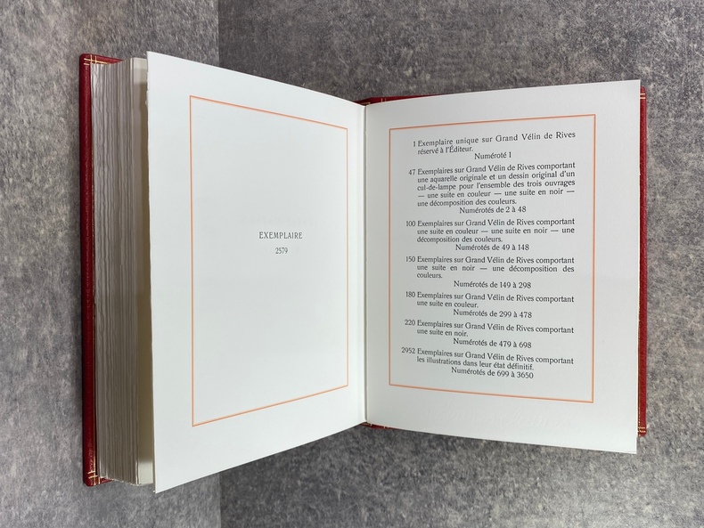 PARIS 6°. EDITIONS D'ART LES HEURES CLAIRES. 1977-1981. 3 TOMES EN 3 VOLUMES PETIT IN-4 (20,5 X 25,5 X 17 CENTIMETRES ENVIRON) DE 267 + 245 ET 189 PAGES, RELIURE DE L'EDITEUR A LA BRADEL PLEIN MAROQUIN MOSAIQUE ROUGE, ROUGE FONCE ET ORANGE, TITRE ET TETE DORES, SOUS ETUI BORDE. ILLUSTRE DE 48 BELLES MINIATURES GRAVEES SUR BOIS EN COULEURS ET DE 66 VIGNETTES TIREES EN GRIS. PREMIER TIRAGE, LIMITE A 3650 EXEMPLAIRES NUMEROTES, TOUS SUR GRAND VELIN DE RIVES. UN DES 2952 COMPORTANT LES ILLUSTRATIONS DANS LEUR ETAT DEFINITIF, CELUI-CI PORTANT LE NUMERO 2579. PETITES TRACES DE FROTTEMENT SUR LES ETUIS CARTONNES, SANS AUCUNE GRAVITE, SINON BEL EXEMPLAIRE.