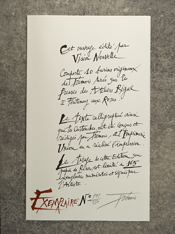 PARIS. EDITIONS VISION NOUVELLE. 1990. IN-FOLIO (24 X 39 CENTIMETRES ENVIRON) EN FEUILLES DE 57 PAGES SOUS COUVERTURE CREME REMPLIEE, CHEMISE CARTONNEE CALLIGRAPHIEE EN ROUGE ET EN NOIR PAR TREMOIS, ET ETUI EN PLASTIQUE TRANSPARENT. TEXTE CALLIGRAPHIE PAR TREMOIS. ILLUSTRE DE 10 BURINS ORIGINAUX DE TREMOIS, TOUS A DOUBLE PAGE. TIRAGE LIMITE A 165 EXEMPLAIRES NUMEROTES ET SIGNES PAR L'ARTISTE, TOUS SUR VELIN DE RIVES. UN DES 150 EXEMPLAIRES RESERVES A LA VENTE, CELUI-CI PORTANT LE NUMERO 101. TRES BEL EXEMPLAIRE.