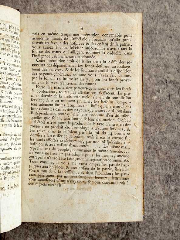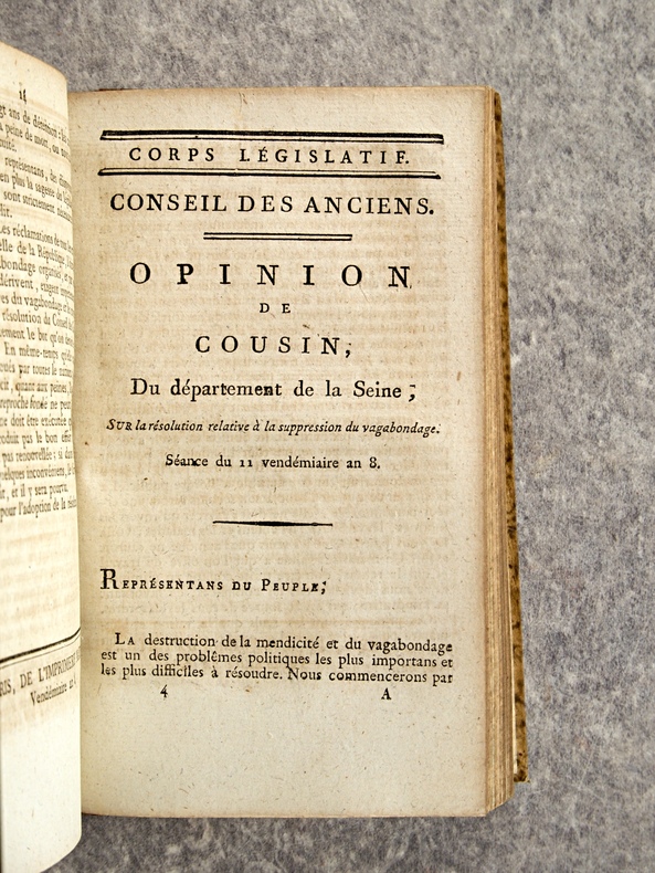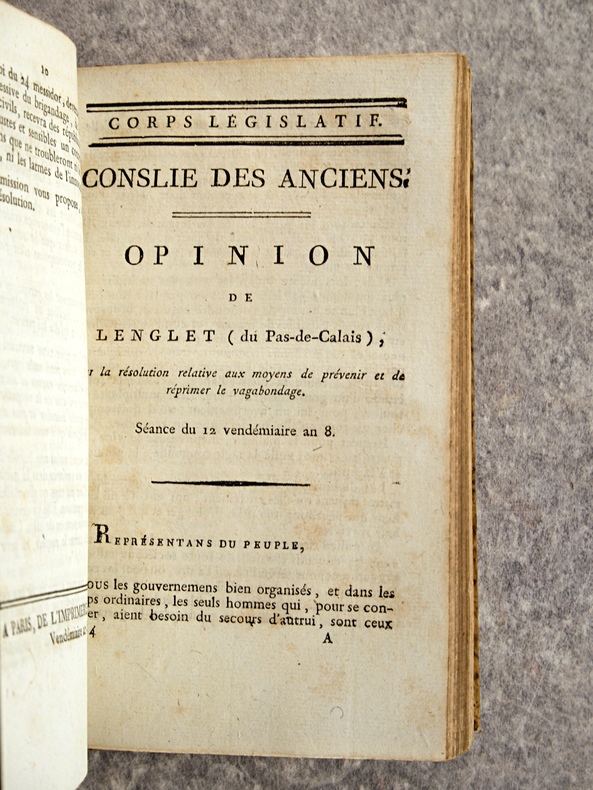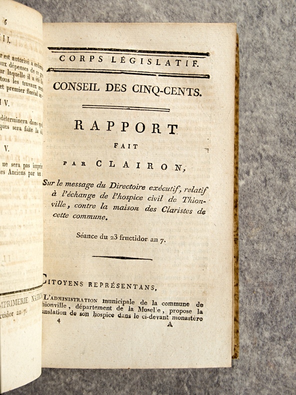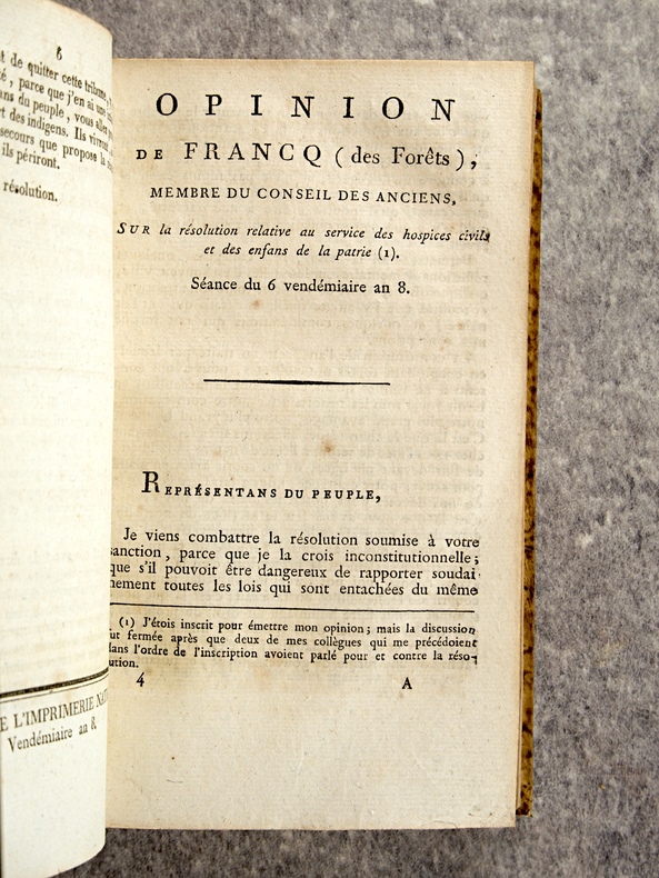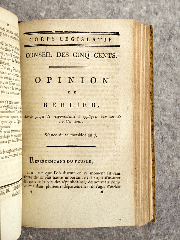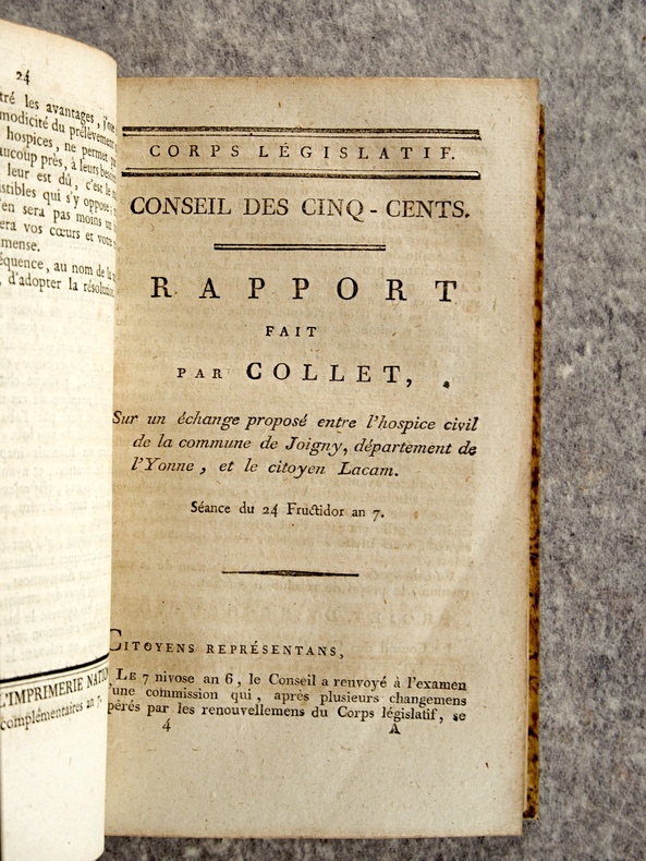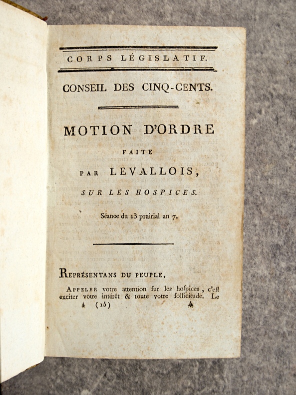 1799-1800. . EXCEPTIONNEL ENSEMBLE DE 66 DOCUMENTS EN UN VOLUME, RELIURE D’EPOQUE 1/2 VEAU HAVANE, DOS LISSE ORNE DE FLEURONS ET DE FILETS DORES, TITRE DORE SUR ETIQUETTE MAROQUIN NOIR. CONTIENT :- HOSPICES CIVILS (24 PIECES).- MOTION D’ORDRE FAITE PAR LEVALLOIS, SUR LES HOSPICES, SEANCE DU 13 PRAIRIAL AN 7. 4 PAGES.- RAPPORT FAIT PAR DELECLOY, AU NOM D’UNE COMMISSION SPECIALE SUR LA RESOLUTION DU 22 GERMINAL AN 7, RELATIVE A L’ADMINISTRATION DES HOSPICES CIVILS, SEANCE DU 9 MESSIDOR AN 7. 18 PAGES.- OPINION D’APPERT, SUR LA RESOLUTION DU 22 GERMINAL AN 7, SEANCE DU 15 MESSIDOR AN 7 (HOSPICES CIVILS). 7 PAGES.- OPINION DE PORCHER, SUR LA RESOLUTION DU 26 GERMINAL AN 7, RELATIVE AUX HOSPICES, SEANCE DU 16 MESSIDOR AN 7 . 38 PAGES.- OPINION DE J. P. PEZOUS, DEPUTE DU DEPARTEMENT DU TARN, SUR LA RESOLUTION DU 22 GERMINAL AN 7, RELATIVE A L’ORGANISATION DES HOSPICES CIVILS, SEANCE DU 16 MESSIDOR AN 7. 10 PAGES.- MOTION D’ORDRE FAITE PAR LEVALLOIS, SUR LES ARRETES CONTRAIRES AUX LOIS, SEANCE DU 18 MESSIDOR AN 7 (HOSPICES CIVILS). 4 PAGES.- RAPPORT FAIT PAR DELORME, SUR L’ETABLISSEMENT DEFINITIF DE L’HOSPICE CIVIL DE SAUMUR DANS LA MAISON DITE NOTRE-DAME, SEANCE DU 21 THERMIDOR AN 7. 6 PAGES.- RAPPORT FAIT PAR DOUILLARD, SUR UN MESSAGE DU DIRECTOIRE EXECUTIF, RELATIF A LA DEMANDE FAITE PAR L’ADMINISTRATION CENTRALE DE LA LOIRE-INFERIEURE, DE LA MAISON ET JARDIN DES CI-DEVANT URSULINES DE NANTES, POUR Y ETABLIR L’ECOLE CENTRALE. SEANCE DU 13 FRUCTIDOR AN 7. 6 PAGES.- RAPPORT FAIT PAR CLAIRON, SUR LE MESSAGE DU DIRECTOIRE EXECUTIF, RELATIF A L’ECHANGE DE L’HOSPICE CIVIL DE THIONVILLE, CONTRE LA MAISON DES CLARISSES DE CETTE COMMUNE. SEANCE DU 23 FRUCTIDOR AN 7. 3 PAGES.- RAPPORT DE DELZONS, SUR LA RESOLUTION DU 14 FRUCTIDOR AN 7, RELATIVE AU SERVICE DES HOSPICES CIVILS ET DES ENFANTS DE LA PATRIE, SEANCE DU 24 FRUCTIDOR AN 7. 24 PAGES.- RAPPORT FAIT PAR COLLET, SUR UN ECHANGE PROPOSE ENTRE L’HOSPICE CIVIL DE LA COMMUNE DE JOIGNY, DEPARTEMENT DE L’YONNE, ET LE CITOYEN LACAM. SEANCE DU 24 FRUCTIDOR AN 7. 3 PAGES.- RAPPORT FAIT J. C. M. GILLET (DE SEINE-ET-OISE), AU NOM D’UNE COMMISSION SPECIALE, SUR LE MESSAGE DU DIRECTOIRE EXECUTIF, DU 18 THERMIDOR, TENDANT A AUTORISER L’ALIENATION PAR LA VOIE DE BAIL A RENTE, D’UN BATIMENT DES HOSPICES DE PONTOISE. SEANCE DU 9 FRUCTIDOR AN 7. 4 PAGES.- RAPPORT FAIT PAR IMBERT, AU NOM D’UNE COMMISSION SPECIALE, SUR UN MESSAGE DU DIRECTOIRE EXECUTIF, DU 29 THERMIDOR, RELATIF A UN ECHANGE DE PROPRIETE ENTRE L’ HOSPICE CIVIL DE SAINT-CHEF ET LE CITOYEN DUCROS, OFFICIER DE SANTE. SEANCE DU 26 FRUCTIDOR AN 7. 4 PAGES.- RAPPORT FAIT IMBERT, AU NOM D’UNE COMMISSION SPECIALE, SUR UN MESSAGE DU DIRECTOIRE EXECUTIF, DU 27 PRAIRIAL, TENDANT A AUTORISER LA COMMISSION ADMINISTRATIVE DE L’HOSPICE CIVIL DE BOURGOIN A ALIENER TRENTE METRES DE TERREIN (SIC). SEANCE DU 26 FRUCTIDOR AN 7. 4 PAGES.- OPINION DE GUILLAUME LANGLOIS (DE L’EURE), SUR LA RESOLUTION DU 14 FRUCTIDOR AN 7, RELATIVE AU SERVICE DES HOSPICES CIVILS ET DES ENFANTS DE LA PATRIE. SEANCE DU 6 VENDEMIAIRE AN 8. 15 PAGES.- OPINION DE DELECLOY, SUR LA RESOLUTION DU 24 FRUCTIDOR, RELATIVE AU SERVICE DES HOSPICES CIVILS ET DES ENFANTS DE LA PATRIE. SEANCE DU 6 VENDEMIAIRE AN 8. 6 PAGES.- OPINION DE FRANCQ (DES FORETS), MEMBRE DU CONSEIL DES ANCIENS, SUR LA RESOLUTION RELATIVE AU SERVICE DES HOSPICES CIVILS ET DES ENFANTS DE LA PATRIE. SEANCE DU 6 VENDEMIAIRE AN 8. 20 PAGES.- RAPPORT FAIT PAR BELZAIS-COURMENIL, AU NOM DE LA COMMISION DES HOSPICES CIVILS, RELATIVEMENT A L’EXECUTION DE LA LOI DU 16 MESSIDOR AN 7. SEANCE DU 17 VENDEMIAIRE AN 8. 11 PAGES.- RAPPORT FAIT TRUMEAU, AU NOM D’UNE COMMISSION SPECIALE, SUR UN MESSAGE DU DIRECTOIRE EXECUTIF RELATIF A UN ECHANGE PROPOSE A L’HOSPICE CIVIL DE LA COMMUNE DE LEVROUX, DEPARTEMENT DE L’INDRE. SEANCE DU 23 VENDEMIAIRE AN 8. 4 PAGES.- RAPPORT FAIT CAILLEMER (DE LA MANCHE), SUR UNE RESOLUTION DU 11 FRUCTIDOR, PORTANT INTERPRETATION DU N° 5 DE L’ARTICLE XXIX DE LA LOI DU PREMIER BRUMAIRE AN 7, QUI DISPENSE DE LA PATENTE LES OFFICIERS DE SANTE ATTACHES AUX ARMEES, AUX HOPITAUX ET AU SERVICE DES PAUVRES. SEANCE DU 24 VENDEMIAIRE AN 8. 10 PAGES.- OPINION DE J. G. JAN (DE L’EURE), SUR LA RESOLUTION DU 24 FRUCTIDOR, PORTANT QUE LE N° 5 DE L’ARTICLE XXIX DE LA LOI DU PREMIER BRUMAIRE AN 7, SUR LES PATENTES EST APPLICABLE, SANS DISTINCTION, A TOUS LES OFFICIERS DE SANTE ATTACHES AUX ARMEES, AUX HOPITAUX ET AU SERVICE DES PAUVRES, PAR NOMINATION DU GOUVERNEMENT OU DES AUTORITES CONSTITUEES. SEANCE DU 24 VENDEMIAIRE AN 8. 7 PAGES.- RAPPORT FAIT PAR LEFEBVRIER, AU NOM D’UNE COMMISSION SPECIALE, CHARGEE D’EXAMINER UN MESSAGE DU DIRECTOIRE EXECUTIF DU 28 FRUCTIDOR AN 7, SUR LA DEMANDE DE LA COMMISSION ADMINISTRATIVE DE L’HOSPICE CIVIL DE LA COMMUNE D’HONFLEUR, TENDANTE A OBTENIR DU CORPS LEGISLATIF LA CONFIRMATION DE LA VENTE D’UN DOMAINE NATIONAL, FAITE AU PROFIT DUDIT HOSPICE PAR L’ADMINISTRATION CENTRALE DU DEPARTEMENT DU CALVADOS. SEANCE DU 28 VENDEMIAIRE AN 8. 6 PAGES.- RAPPORT FAIT PAR SEDILLEZ, SUR UNE RESOLUTION QUI CONFIRME UN BAIL A RENTE DE BATIMENS ET TERREINS DEPENDANS DE L’HOSPICE CIVIL DE PONTOISE. SEANCE DU 9 BRUMAIRE AN 8. 7 PAGES.- RAPPORT FAIT PAR HENRYS-MARCILLY, DEPUTE DE LA HAUTE-MARNE, AU NOM D’UNE COMMISSION SPECIALE, SUR UN MESSAGE DU DIRECTOIRE EXECUTIF RELATIF A UN ECHANGE DE PROPRIETES ENTRE L’HOSPICE CIVIL DE CHALONS-SUR-MARNE, ET LE CITOYEN FALQUENEL, DE SAINT-MARD-SUR-LE-MONT. SEANCE DU 11 BRUMAIRE AN 8. 4 PAGES.
