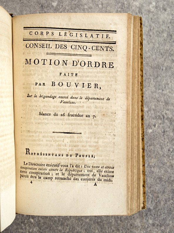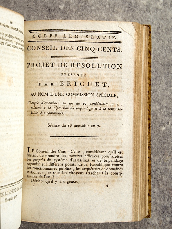 - BRIGANDAGE. VAGABONDAGE (42 PIECES).- OPINION DE FRANCAIS, SUR LES ASSASSINATS COMMIS EN HAINE DE LA REVOLUTION. SEANCE DU 8 PRAIRIAL AN 7. 6 PAGES.- MOTION D’ORDRE DE SHELOCK, DEPUTE DE VAUCLUSE, SUR LES ASSASSINATS QUI SE COMMETTENT DANS LE DEPARTEMENT DE VAUCLUSE. SEANCE DU 12 PRAIRIAL AN 7. 5 PAGES.- OBSERVATIONS DE NATOIRE, SUR DIVERS ASSASSINATS COMMIS DANS LE DEPARTEMENT DES BOUCHES-DU-RHONE. SEANCE DU 13 PRAIRIAL AN 7. 3 PAGES.- NOUVEAU PROJET DE RESOLUTION PRESENTE PAR ROEMERS, SUR LA POLICE & LA RESPONSABILITE DES COMMUNES. SEANCE DU 21 PRAIRIAL AN 7. 16 PAGES.- OPINION DE GUESDON, SUR LE PROJET DE ROEMERS, RELATIF A LA RESPONSABILITE DES COMMUNES.. SEANCE DU 12 MESSIDOR AN 7. 16 PAGES.- OPINION DE MEMBREDE (DE LA MEUSE-INFERIEURE), SUR LE NOUVEAU PROJET DE RESOLUTION, PRESENTE PAR ROEMERS, SUR LA POLICE ET LA RESPONSABILITE DES COMMUNES. SEANCE DU 12 MESSIDOR AN 7. 8 PAGES.- MOTION D’ORDRE FAITE PAR JAPHET (D’INDRE ET LOIRE), SUR UN PLACARD DE LOIS IMPRIME A LYON AVEC DES SIGNES DE FANATISME ET DE ROYAUTE. SEANCE DU 4 MESSIDOR AN 7. 3 PAGES.- OPINION DE RALLIER, SUR LE PROJET DE RESOLUTION DU 21 PRAIRIAL AN 7, RELATIF A LA RESPONSABILITE DES COMMUNES. SEANCE DU 12 MESSIDOR AN 7. 12 PAGES.- PROJET DE RESOLUTION PRESENTE PAR BRICHET, AU NOM D’UNE COMMISSION SPECIALE, CHARGEE D’EXAMINER LA LOI DU 10 VENDEMIAIRE AN 4, RELATIVE A LA REPRESSION DU BRIGANDAGE ET LA RESPONSABILITE DES COMMUNES. SEANCE DU 18 MESSIDOR AN 7. 12 PAGES.- OPINION DE BERLIER, SUR LE PROJET DE RESPONSABILITE A APPLIQUER AUX CAS DE TROUBLES CIVILS. SEANCE DU 21 MESSIDOR AN 7. 10 PAGES. (EXEMPLAIRE RELIE ICI EN DOUBLE).- RAPPORT FAIT PAR BRICHET (DE MAINE-ET-LOIRE), AU NOM D’UNE COMMISSION SPECIALE, SUR LES MOYENS DE REPRIMER LES ASSASSINATS ET LES BRIGANDAGES. SEANCE DU 22 MESSIDOR AN 7. 10 PAGES.- RAPPORT FAIT PAR DELPERRIER AINE, AU NOM D’UNE COMMISSION SPECIALE, SUR UNE PETITION DE L’AGENT MUNICIPAL DE LA COMMUNE, CHEF-LIEU DU CANTON D’HORTES, DEPARTEMENT DE LA HAUTE-MARNE, AYANT POUR OBJET D’OBTENIR L’AUTORISATION DU CORPS LEGISLATIF, A L’EFFET DE FAIRE L’ACQUISITION DU CI-DEVANT PRESBYTERE DE CETTE COMMUNE, ET DE VENDRE DES TERREINS COMMUNAUX POUR PAYER LE PRIX DE CETTE ACQUISITION. SEANCE DU 22 MESSIDOR AN 7. 4 PAGES.- RAPPORT DE B.-M. DECOMBEROUSSE, SUR LA RESOLUTION RELATIVE A LA REPRESSION DU BRIGANDAGE ET DES ASSASSINATS DANS L’INTERIEUR DE LA REPUBLIQUE. SEANCE DU 24 MESSIDOR AN 7. 6 PAGES.- OPINION DE J. GAUTRET (DE MAINE-ET-LOIRE), SUR LA RESOLUTION DU 22 MESSIDOR AN 7, RELATIVE AUX ASSASSINATS ET AUX BRIGANDAGES DANS PLUSIEURS DEPARTEMENS DE LA REPUBLIQUE. SEANCE DU 24 MESSIDOR AN 7. 6 PAGES.- DEPARTEMENT DE LA HAUTE-GARONNE. TOULOUSE LE 5 THERMIDOR AN 7 DE LA REPUBLIQUE FRANCAISE A SEPT HEURES DU MATIN. LE COMMISSAIRE DU DIRECTOIRE EXECUTIF PRES L’ADMINISTRATION CENTRALE DU DEPARTEMENT DE LA HAUTE-GARONNE, AUX CITOYENS REPRESENTANS DU PEUPLE COMPOSANT LA DEPUTATION DE CE MEME DEPARTEMENT. RAPPORT DU COMBAT QUI A EU LIEU DEVANT MONTREJEAN ENTRE LES COLONNES DES REPUBLICAINS COMMANDEES PAR LES ADJUDANS-GENERAUX BARBOT ET VICOSE, SOUS LES ORDRES DU GENERAL DE BRIGADE COMMES, CONTRE LES BRIGANDS ROYAUX COMMANDES PAR LE CI-DEVANT GENERAL DE BRIGADE ROUGE ET LE CI-DEVANT COMTE DE PAULO. FRUCTIDOR AN 7. 7 PAGES.- MOTION D’ORDRE FAITE PAR DOCHE-DELISLE, SUR L’ARRESTATION DES DILIGENCES ET LE VOL DES DENIERS PUBLICS, SUR LE CIVISME ET LE COURAGE DE DOUZE CONSCRITS DU DEPARTEMENT DE LA CHARENTE, QUI ONT MIS DES BRIGANDS EN DEROUTE. SEANCE DU 14 THERMIDOR AN 7. 6 PAGES.- RAPPORT FAIT PAR REGNIER, SUR LA RESOLUTION QUI APPLIQUE AU DEPARTEMENT DE LA HAUTE-GARONNE TOUTES LES DISPOSITIONS DE LA LOI DU 24 THERMIDOR AN 7. SEANCE DU 3 FRUCTIDOR AN 7. 3 PAGES.- DIRE DE CORNET, SUR LA RESOLUTION DU 23 MESSIDOR RELATIVE A LA REPRESSION DU BRIGANDAGE. SEANCE DU 24 MESSIDOR AN 7. 2 PAGES.- RAPPORT FAIT PAR BERLIER, AU NOM D’UNE COMMISSION SPECIALE, SUR UN MESSAGE DU DIRECTOIRE EXECUTIF, TENDANT A FAIRE JUGER PAR DES COMMISSIONS MILITAIRES LES PREVENUS D’EMBOUCHAGE, D’ASSASSINAT, DE BRIGANDAGE ET D’ESPIONNAGE. SEANCE DU 3 FRUCTIDOR AN 7. 11 PAGES.- RAPPORT FAIT PAR LEMERCIER, DE LA CHARENTE-INFERIEURE, AU NOM D’UNE COMMISSION SPECIALE, SUR LA RESOLUTION DU 9 DE CE MOIS, QUI AUTORISE LE DIRECTOIRE EXECUTIF, LORSQU’UN DEPARTEMENT SERA DECLARE EN ETAT DE TROUBLES CIVILS, A Y FAIRE ETABLIR UN CONSEIL DE GUERRE POUR JUGER LES DELITS DONT LA CONNOISSANCE EST ATTRIBUEE AUX CONSEILS DE GUERRE. SEANCE DU 14 FRUCTIDOR AN 7. 8 PAGES.- MOTION D’ORDRE FAITE PAR BARDOU-BOISQUETIN, DEPUTE DE LA SARTHE, RELATIVE A L’APPLICATION DE LA LOI DU 24 MESSIDOR AN 7 SUR LES OTAGES, ET A DIFFERENS OBJETS DE GRANDE POLICE. SEANCE DU 24 FRUCTIDOR AN 7. 11 PAGES.- MOTION D’ORDRE FAITE PAR BOUVIER, SUR LE BRIGANDAGE EXERCE DANS LE DEPARTEMENT DE VAUCLUSE. SEANCE DU 26 FRUCTIDOR AN 7. 10 PAGES.- RAPPORT FAIT AU NOM D’UNE COMMISSION SPECIALE, PAR J. G. JAN (DE L’EURE), SUR LA RESOLUTION DU 28 FRUCTIDOR AN 7, QUI APPLIQUE LA LOI DU 24 MESSIDOR, RELATIVE A LA REPRESSION DU BRIGANDAGE, AU DEPARTEMENT D’ILLE-ET-VILAINE. SEANCE DU PREMIER JOUR COMPLEMENTAIRE AN 7. 4 PAGES.- RAPPORT FAIT PAR BARRE (DE LA SARTHE), SUR L’APPLICATION DE LA LOI DU 24 MESSIDOR, SUR LA REPRESSION DU BRIGANDAGE, AU DEPARTEMENT DE LA SARTHE. SEANCE DU PREMIER JOUR COMPLEMENTAIRE (AN 7). 4 PAGES.- OPINION DE LAPOTAIRE, SUR L’APPLICATION DES DISPOSITIONS DE LA LOI DU 24 MESSIDOR AN 7, RELATIVE A LA REPRESSION DU BRIGANDAGE, AU DEPARTEMENT DU MORBIHAN. SEANCE DU 2° JOUR COMPLEMENTAIRE AN 7. 6 PAGES.- RAPPORT FAIT PAR VOLIGNY (DE LA NIEVRE), SUR LA RESOLUTION DU 28 FRUCTIDOR AN 7, QUI DECLARE APPLICABLE A DIVERS CANTONS DU DEPARTEMENT DE MAINE-ET-LOIRE LA LOI DU 24 MESSIDOR PRECEDENT RELATIVE A LA REPRESSION DU BRIGANDAGE. SEANCE DU DEUXIEME JOUR COMPLEMENTAIRE AN 7. 6 PAGES.- RAPPORT FAIT PAR P. GUYOMAR (COTES-DU-NORD), SUR LA RESOLUTION DU 28 FRUCTIDOR AN 7, QUI DECLARE APPLICABLE AU DEPARTEMENT DES COTES-DU-NORD LA LO
