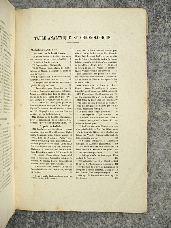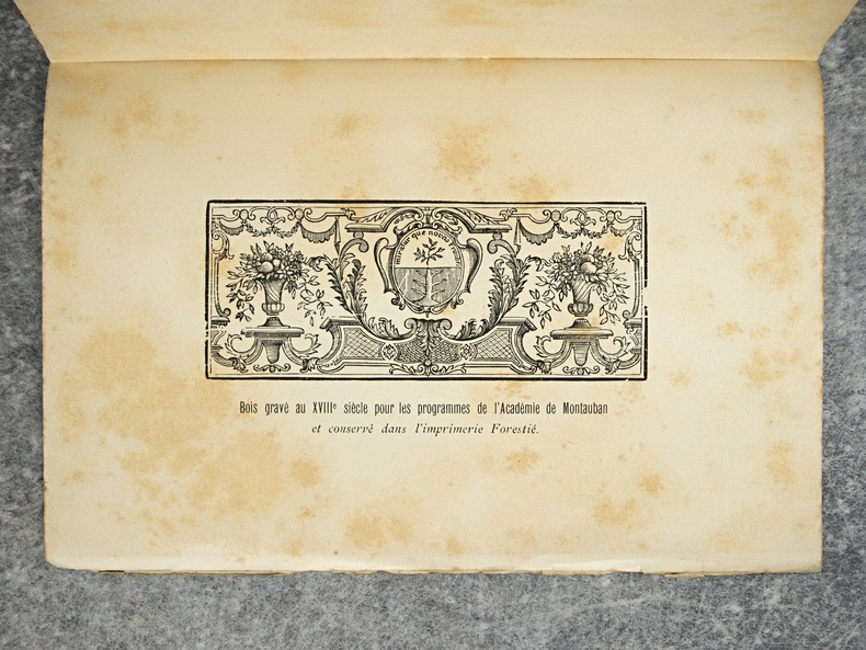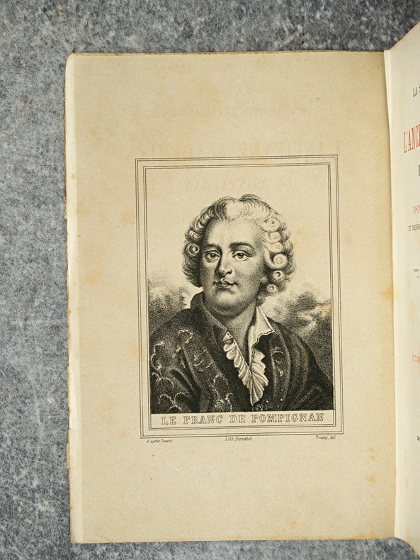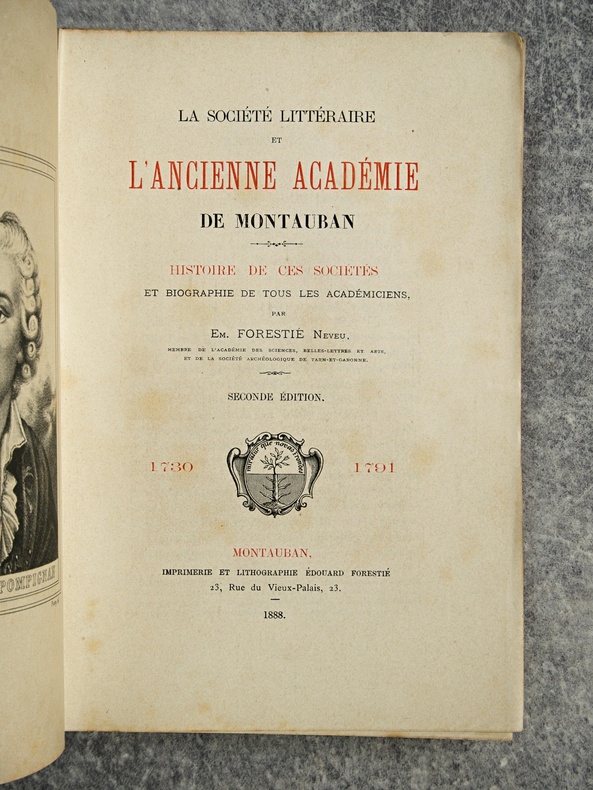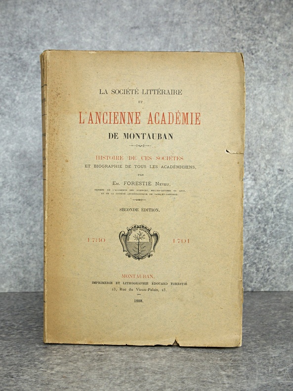 MONTAUBAN. IMPRIMERIE ET LITHOGRAPHIE EDOUARD FORESTIE. 1888. IN-8 BROCHE (16 X 24 X 2 CENTIMETRES ENVIRON) DE (6) + 312 PAGES, COUVERTURE GRISE, TITRE IMPRIME EN ROUGE ET EN NOIR. ILLUSTRE D’UNE PLANCHE HORS TEXTE, D’UN PORTRAIT LITHOGRAPHIE EN FRONTISPICE, D’APRES DEVERIA, DE LEFRANC DE POMPIGNAN, AINSI QUE D’UN PORTRAIT LITHOGRAPHIE HORS-TEXTE DE MICHEL DE VERTHAMON, EVEQUE DE MONTAUBAN. EX-DONO MANUSCRIT SUR LE FEUILLET DE FAUX-TITRE: «OFFERT PAR L’AUTEUR A M. J. BOURDEU».PETITS DEFAUTS EXTERIEURS, DONT PETIT MANQUE DE PAPIER SUR LE PLAT INFERIEUR DE LA COUVERTURE, SINON BON EXEMPLAIRE DE CET OUVRAGE PEU COURANT.