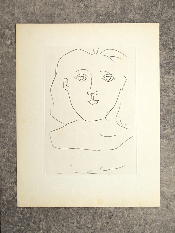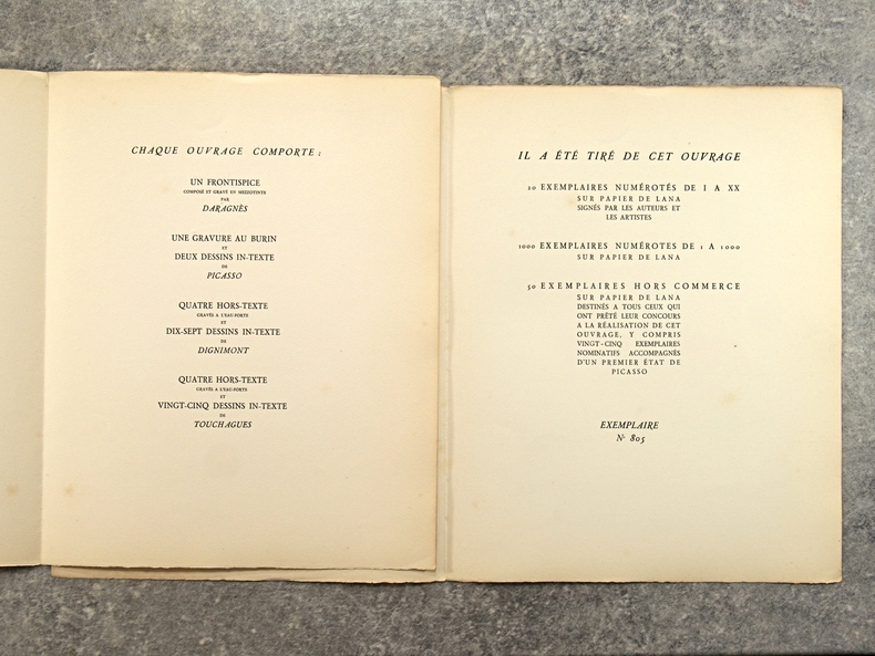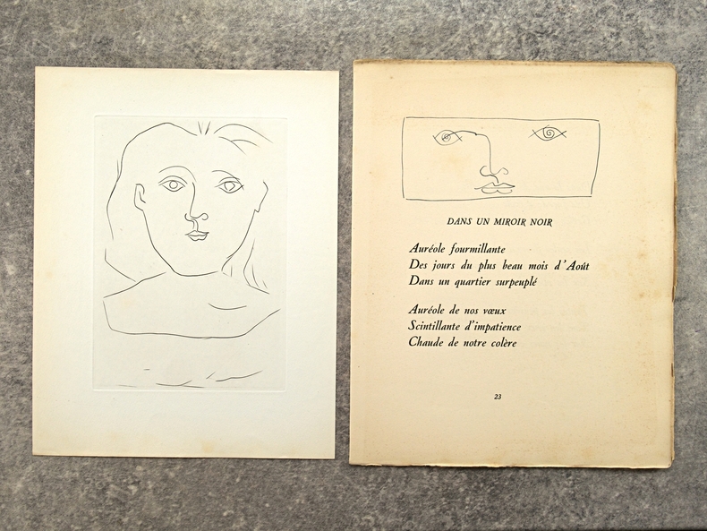 PARIS. LAMBUSIER. (AU PROFIT DES OEUVRES DE LA CROIX ROUGE FRANCAISE POUR LES PRISONNIERS DE GUERRE). 1945. IN-4 EN FEUILLES (28 X 22,5 CENTIMETRES ENVIRON) DE 147 PAGES, COUVERTURE CREME REMPLIEE, TITRE IMPRIME EN ROUGE. ILLUSTRE D'UN FRONTISPICE GRAVE EN MEZZOTINTE PAR DARAGNES, UNE GRAVURE AU BURIN (PORTRAIT DE FRANCOISE GILLOT) ET DEUX IN-TEXTE DE PICASSO, QUATRE HORS TEXTE GRAVES A L'EAU-FORTE ET DIX-SEPT DESSINS IN-TEXTE DE DIGNIMONT, QUATRE HORS TEXTE GRAVES A L'EAU-FORTE ET VINGT-CINQ DESSINS DANS LE TEXTE DE TOUCHAGUES. PREFACE DU GENERAL KOENIG, TEXTES PAR PAUL ELUARD, PAUL VALERY, COLETTE, ANDRE BILLY, ETC. LE BURIN ET LES DEUX DESSINS DE PICASSO ILLUSTRENT LE POEME «DANS UN MIROIR NOIR» DE PAUL ELUARD. EDITION ORIGINALE. TIRAGE LIMITE A 1070 EXEMPLAIRES NUMEROTES, TOUS SUR VELIN DE LANA, DONT 50 HORS COMMERCE, CELUI-CI PORTANT LE NUMERO 805. QUELQUES ROUSSEURS EPARSES SUR LES PAGES DE TEXTE, PLANCHES HORS TEXTE TRES FRAICHES.