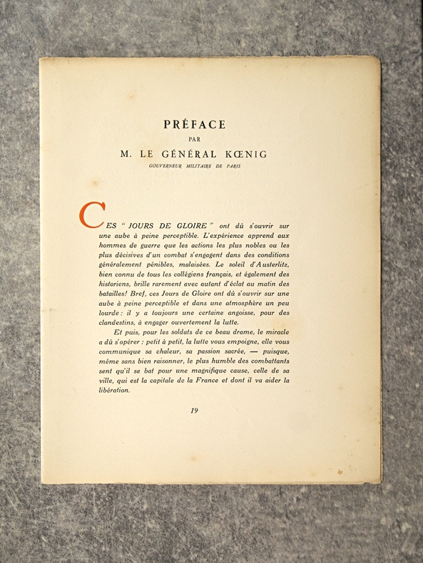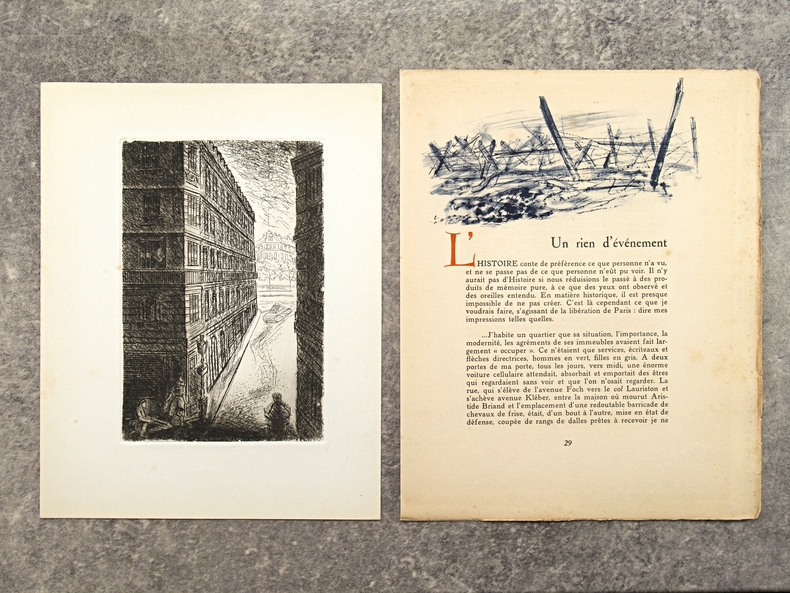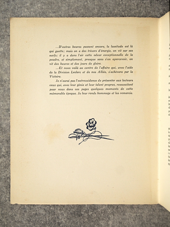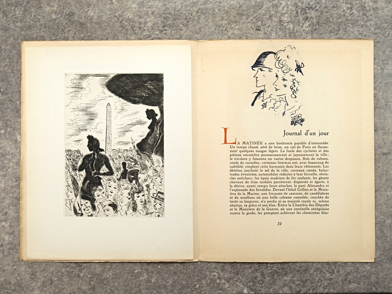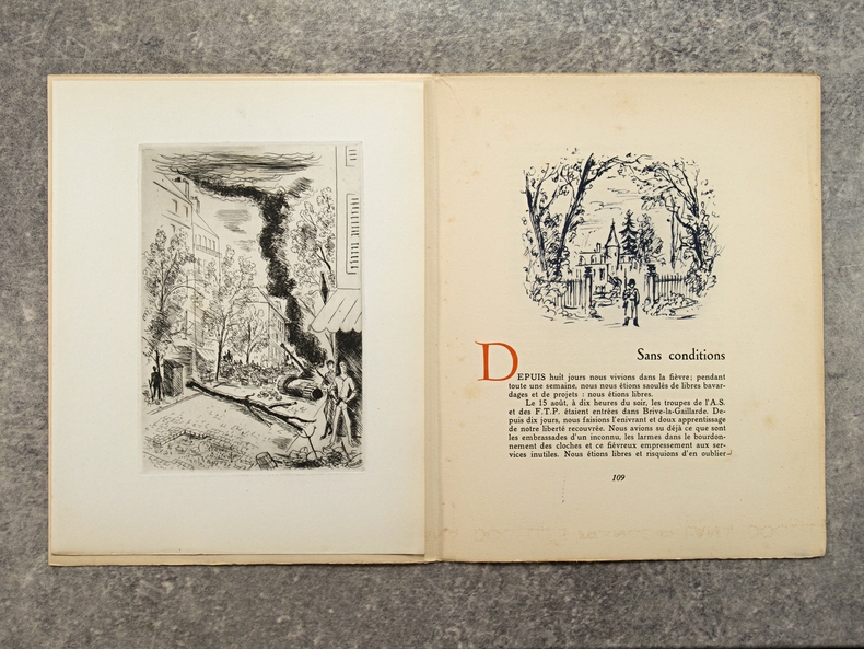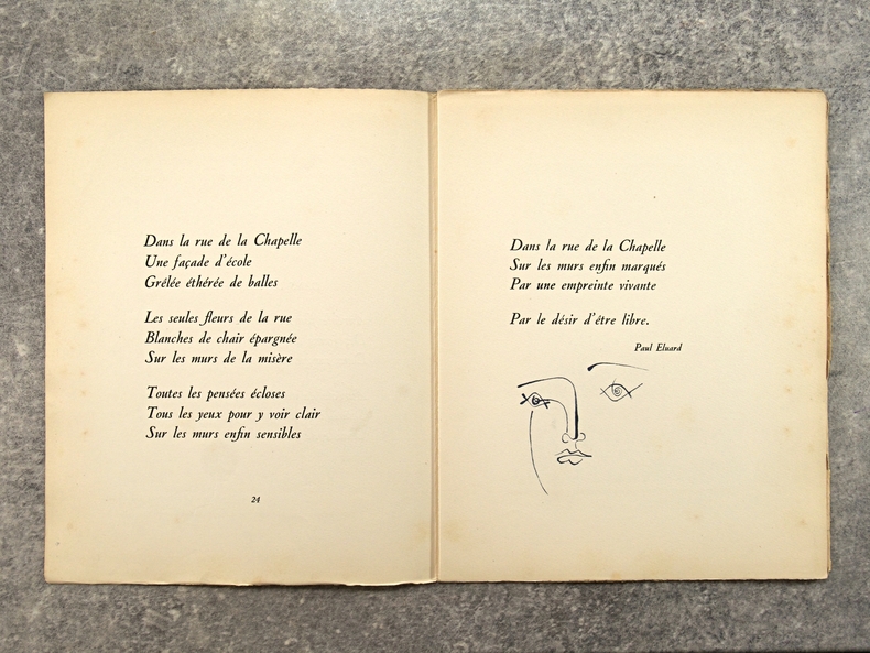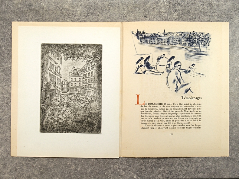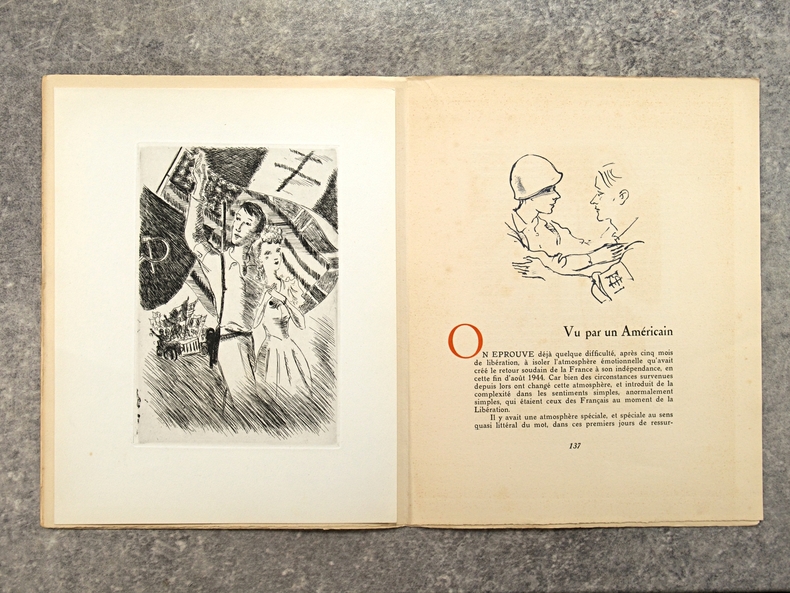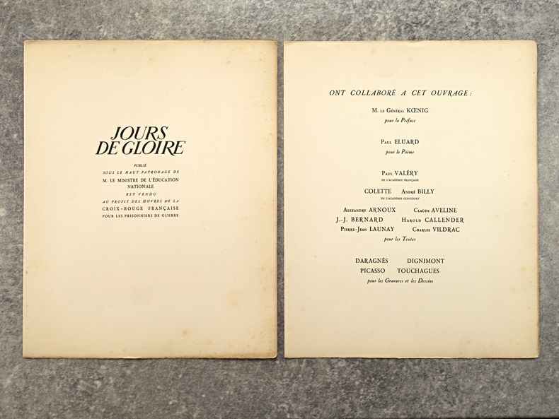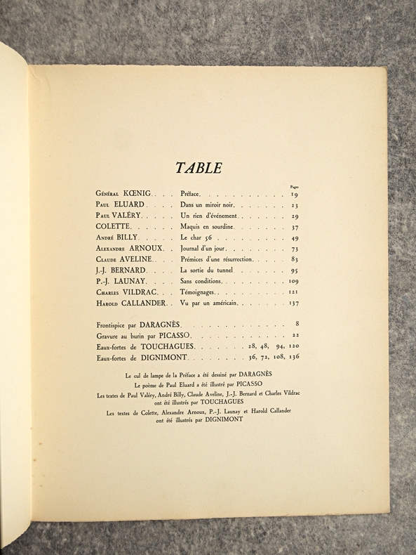 apla5. Broché. Paris, édition Lambusier, in-4, 143 pages, en feuillets, sous couverture imprimée rempliée. Edition originale. Tirage limité à 1070 exemplaires , un des 1000 exemplaires numérotés sur Lana. Exemplaire bien complet du frontispice par Daragnès, d'un burin (portrait de Françoise Gilot) et de deux dessins dans le texte par Picasso (qui illustrent un poème d'Éluard), de 4 gravures à l'eau-forte et 17 dessins dans le texte par Dignimont, de 4 gravures à l'eau-forte et 25 dessins dans le texte par Touchagues. Préface du général Koenig, textes de Paul Valéry, Colette, Paul Eluard, André Billy, Alexandre Arnoux, Claude Aveline, J.-J. Bernard, avec cette justification de tirage. Dos jauni avec le temps, photos possibles