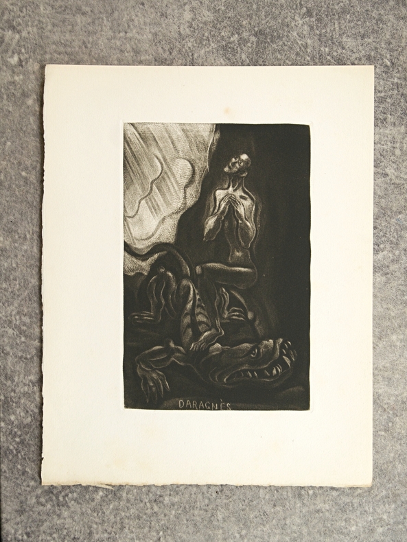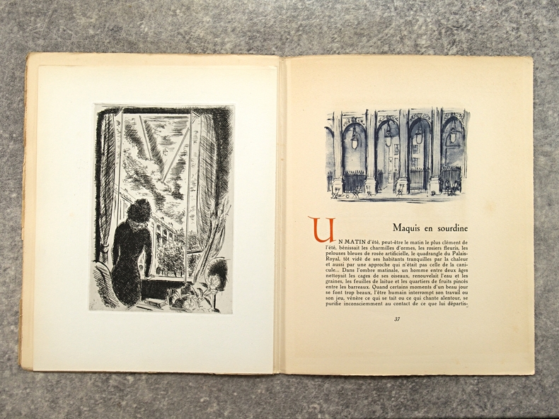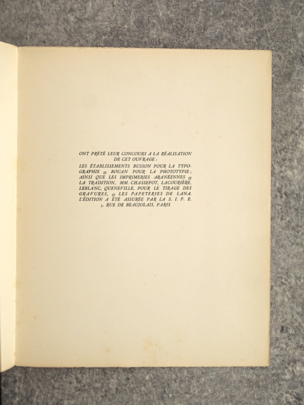 1945 Paris, S.I.P.E., D. Lambusier, [sans date, 1945], 1 volume in-quarto de 220x275 mm environ, 142 pages, complet des 10 hors-texte sous serpente. Édition originale, un des 1000 exemplaires numérotés sur papier de Lana. Demi maroquin rouge à coins, dos portant titre doré, tranche de tête dorée. Quelques épidermures et petites taches sombres sur le cuir, nombreuses rousseurs.