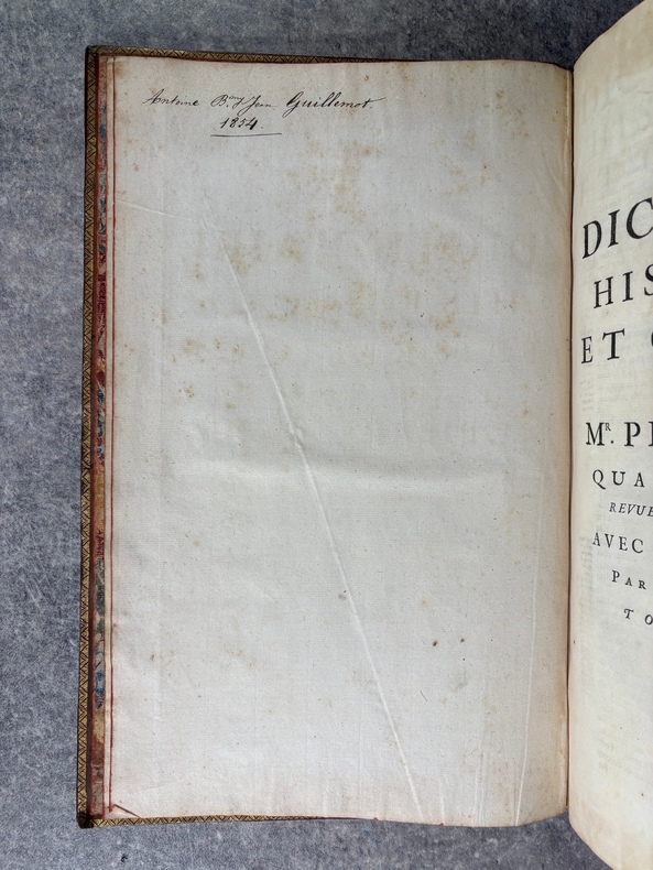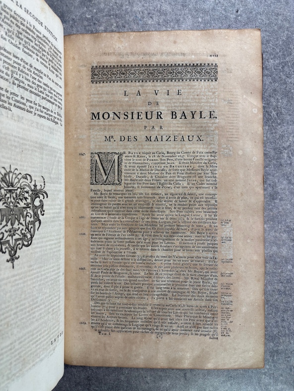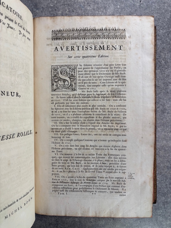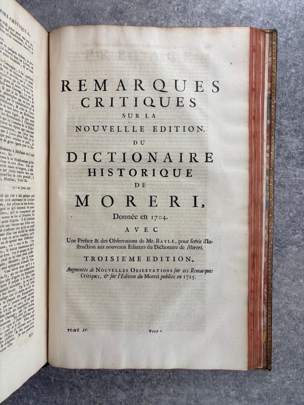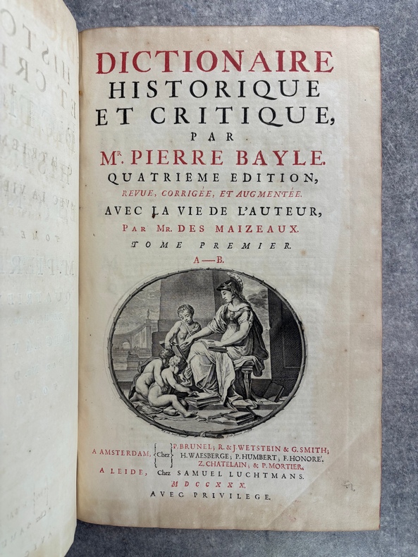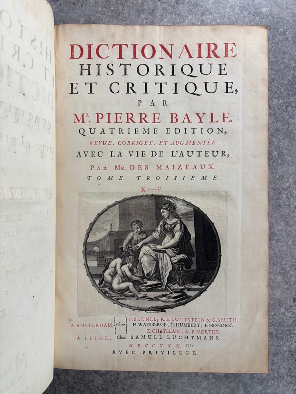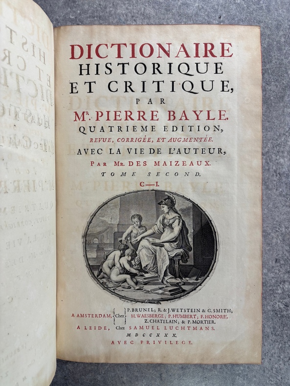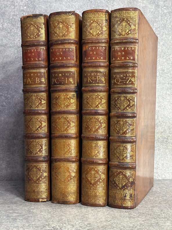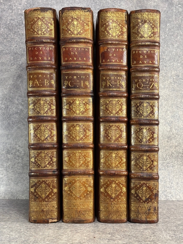 A AMSTERDAM. CHEZ P. BRUNEL, R. & J. WETSTEIN & G. SMITH. H. WAESBERGE, P. HUMBERT, F. HONORE. Z. CHATELAIN, & P. MORTIER. A LEIDE. CHEZ SAMUEL LUCHTMANS. 1730. 4 TOMES EN 4 FORTS VOLUMES IN-FOLIO (27 X 40,5 X 24 CENTIMETRES ENVIRON) DE (12) + CXVI + 719, (4) + 915, (4) + 831 ET (4) + 804 PAGES, RELIURE D'EPOQUE PLEIN VEAU HAVANE, DOS A SIX NERFS ORNE D’UN JOLI DECOR DE FLEURONS DORES, ROULETTE DOREE SUR COUPES, TITRE DORE SUR ETIQUETTES MAROQUIN ROUGE ET VERT. ILLUSTRE D’UN PORTRAIT DE BAYLE EN FRONTISPICE, D'UN GRAND FLEURON-VIGNETTE SUR LE TITRE, IMPRIME EN ROUGE ET EN NOIR, DESSINE PAR A. VAN DER WERFF, GRAVE PAR G. W. GOUWEN, REPETE DANS CHACUN DES 4 VOLUMES; D'UNE TRES BELLE VIGNETTE DESSINEE ET GRAVEE PAR B. PICART SUR LE FEUILLET DE DEDICACE AU DUC D'ORLEANS REGENT DE FRANCE. BIEN COMPLET AU TOME II DE LA DOUBLE LECON CONCERNANT DAVID ROI DES JUIFS, PAGES 253-255, PUIS 908-913. (BRUNET. I. 712). LE FEUILLET DE PRIVILEGE EST EN HOLLANDAIS. TACHE D’ENCRE ANCIENNE SUR LA TRANCHE DES PREMIERES PAGES DU TOME I, SANS AUCUNE ATTEINTE AU TEXTE. TRACE D’UN ANCIEN EX-LIBRIS ENLEVE SANS DOUTE POUR CACHER UNE PROVENANCE. QUELQUES DEFAUTS EXTERIEURS DONT COIFFES ET CHARNIERES, PETIT MANQUE DE CUIR AU NIVEAU DU NERF INFERIEUR DU TOME I, SINON BON EXEMPLAIRE. PRIX ETABLI EN FONCTION DES DEFAUTS SIGNALES.