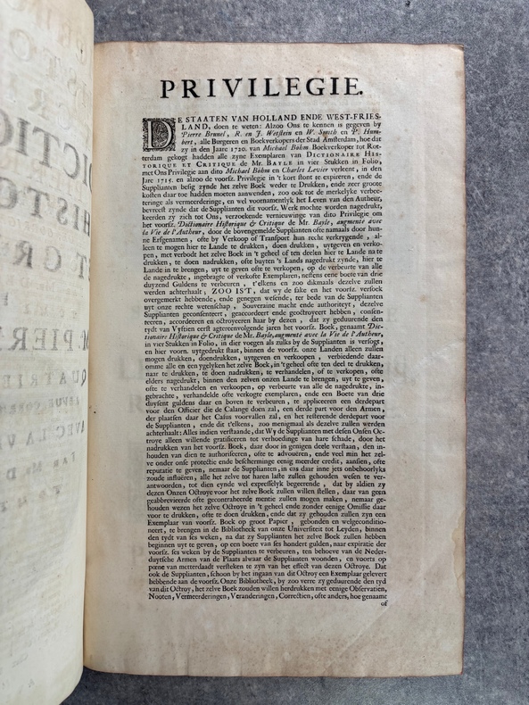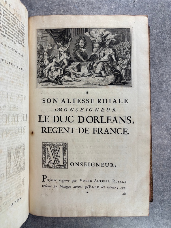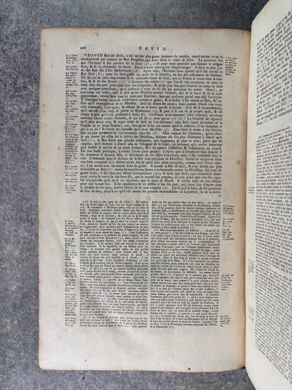 A AMSTERDAM. CHEZ P. BRUNEL, R. & J. WETSTEIN & G. SMITH. H. WAESBERGE, P. HUMBERT, F. HONORE. Z. CHATELAIN, & P. MORTIER. A LEIDE. CHEZ SAMUEL LUCHTMANS. 1730. 4 TOMES EN 4 FORTS VOLUMES IN-FOLIO (27 X 41 X 27,5 CENTIMETRES ENVIRON) DE (14) + CXVI + 719, (4) + 915, (4) + 831 ET (4) + 804 PAGES, RELIURE D'EPOQUE PLEIN VELIN IVOIRE, COUSUE A LA HOLLANDAISE, TITRE MANUSCRIT EN NOIR SUR DOS LISSE, TRANCHES ROUGES. ILLUSTRE D'UN GRAND FLEURON-VIGNETTE SUR LE TITRE, IMPRIME EN ROUGE ET EN NOIR, DESSINE PAR A. VAN DER WERFF, GRAVE PAR G. W. GOUWEN, REPETE DANS CHACUN DES 4 VOLUMES; D'UNE TRES BELLE VIGNETTE DESSINEE ET GRAVEE PAR B. PICART SUR LE FEUILLET DE DEDICACE AU DUC D'ORLEANS REGENT DE FRANCE. BIEN COMPLET DE LA DOUBLE LECON CONCERNANT DAVID ROI DES JUIFS, PAGES PAGES 253-255, PUIS 908-913 DU TOME SECOND. (BRUNET. I. 712). LE FEUILLET DE PRIVILEGE EST EN HOLLANDAIS. QUELQUES PETITS DEFAUTS EXTERIEURS, SINON BON EXEMPLAIRE.