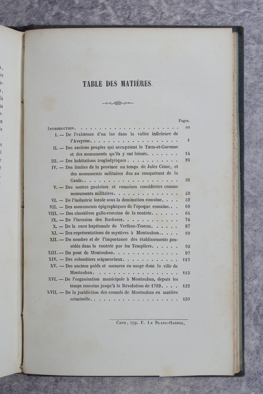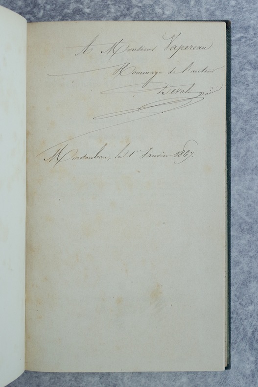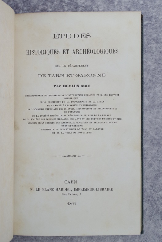 CAEN. F. LEBLANC-HARDEL, IMPRIMEUR-LIBRAIRE. 1866. PETIT IN-8 (13 X 20,5 X 2 CENTIMETRES ENVIRON) DE 184 + (1) PAGES, RELIURE D'EPOQUE A LA BRADEL PLEINE PERCALINE VERTE ORNEE DE MOTIFS A FROID, TITRE DORE. ENVOI D'AUTEUR SIGNE : "A MONSIEUR VAPEREAU, HOMMAGE DE L'AUTEUR. DEVALS AINE. A MONTAUBAN, LE 1° JANVIER 1867". RELIE AVEC : ALBIAS ET SON TERRITOIRE (CANTON DE NEGREPELISSE, TARN-ET-GARONNE), PAR M. DEVALS AINE. BROCHURE DE 36 PAGES. BEL EXEMPLAIRE.