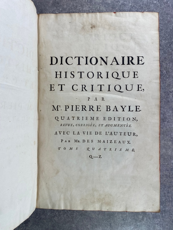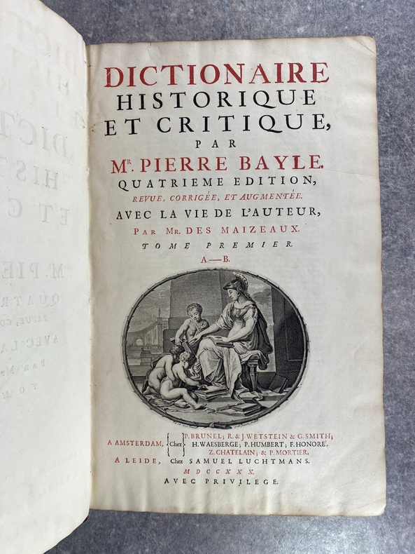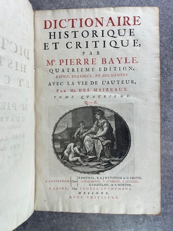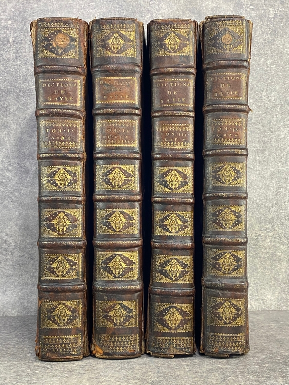 A AMSTERDAM. CHEZ P. BRUNEL, R. & J. WETSTEIN & G. SMITH. H. WAESBERGE, P. HUMBERT, F. HONORE. Z. CHATELAIN, & P. MORTIER. A LEIDE. CHEZ SAMUEL LUCHTMANS. 1730. 4 TOMES EN 4 FORTS VOLUMES IN-FOLIO (27 X 40,5 X 24 CENTIMETRES ENVIRON) DE (12) + CXVI + 719, (4) + 915, (4) + 831 ET (4) + 804 PAGES, RELIURE D'EPOQUE PLEIN VEAU HAVANE, DOS A SIX NERFS ORNE D’UN JOLI DECOR DE FLEURONS DORES, ROULETTE DOREE SUR COUPES, TITRE DORE SUR ETIQUETTES MAROQUIN ROUGE ET VERT. ILLUSTRE D’UN PORTRAIT DE BAYLE EN FRONTISPICE, D'UN GRAND FLEURON-VIGNETTE SUR LE TITRE, IMPRIME EN ROUGE ET EN NOIR, DESSINE PAR A. VAN DER WERFF, GRAVE PAR G. W. GOUWEN, REPETE DANS CHACUN DES 4 VOLUMES; D'UNE TRES BELLE VIGNETTE DESSINEE ET GRAVEE PAR B. PICART SUR LE FEUILLET DE DEDICACE AU DUC D'ORLEANS REGENT DE FRANCE. BIEN COMPLET AU TOME II DE LA DOUBLE LECON CONCERNANT DAVID ROI DES JUIFS, PAGES 253-255, PUIS 908-913. (BRUNET. I. 712). LE FEUILLET DE PRIVILEGE EST EN HOLLANDAIS. TACHE D’ENCRE ANCIENNE SUR LA TRANCHE DES PREMIERES PAGES DU TOME I, SANS AUCUNE ATTEINTE AU TEXTE. TRACE D’UN ANCIEN EX-LIBRIS ENLEVE SANS DOUTE POUR CACHER UNE PROVENANCE. QUELQUES DEFAUTS EXTERIEURS DONT COIFFES ET CHARNIERES, PETIT MANQUE DE CUIR AU NIVEAU DU NERF INFERIEUR DU TOME I, SINON BON EXEMPLAIRE. PRIX ETABLI EN FONCTION DES DEFAUTS SIGNALES.